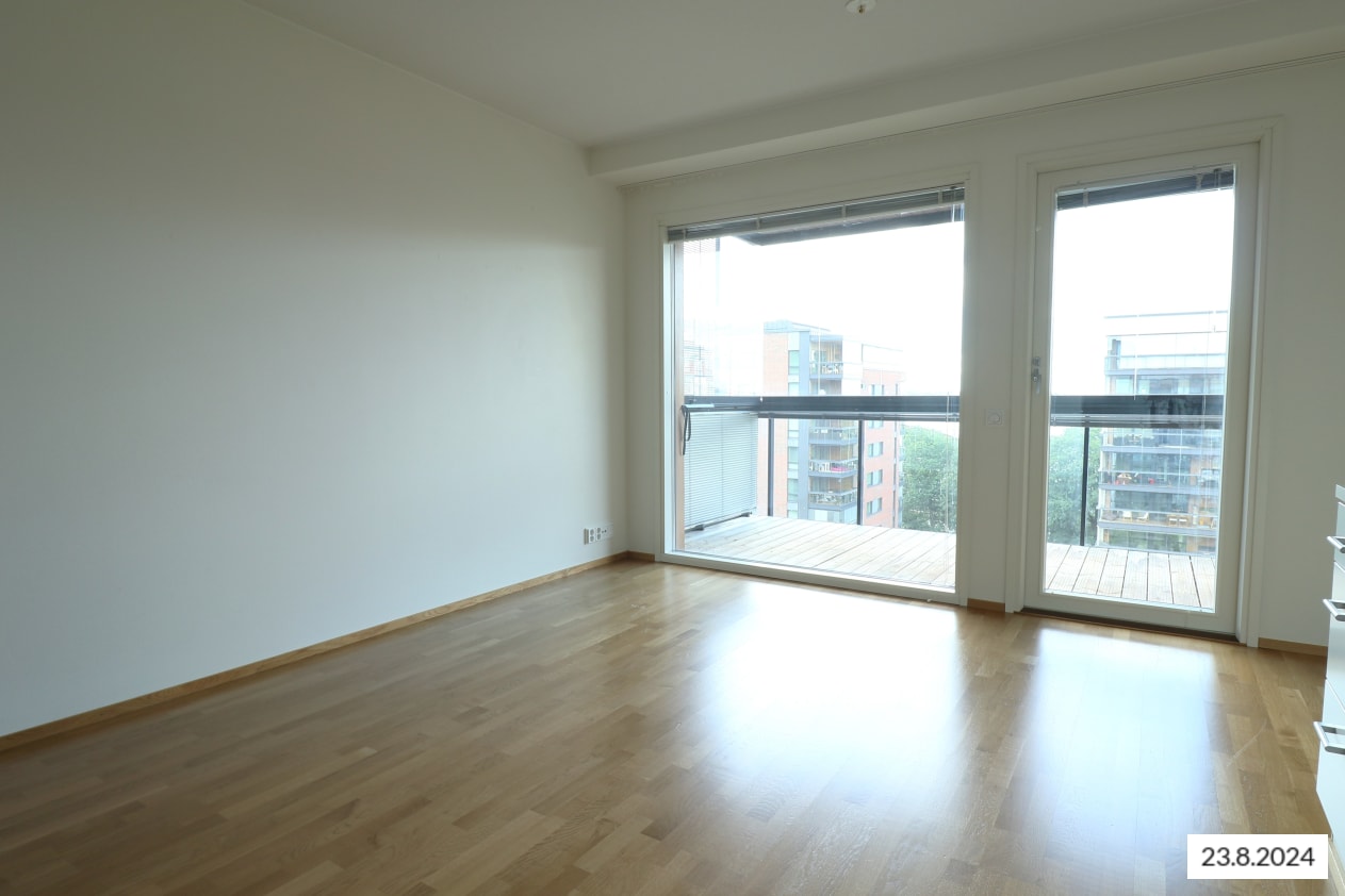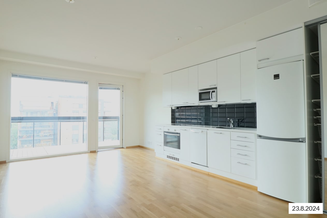 Toiseksi ylimmän kerroksen selkeälinjainen yksiö, jonka olohuone ja avoin keittiötila muodostavat viihtyisän kokonaisuuden. Lisää oleskelutilaa löytyy mukavan kokoiselta lasitetulta parvekkeelta, jonka kaiteet ovat kirkasta lasia ja lattialla on puuritilät. Eteisessä säilytystilaa tarjoaa peililiukuovin varustettu kaapisto.