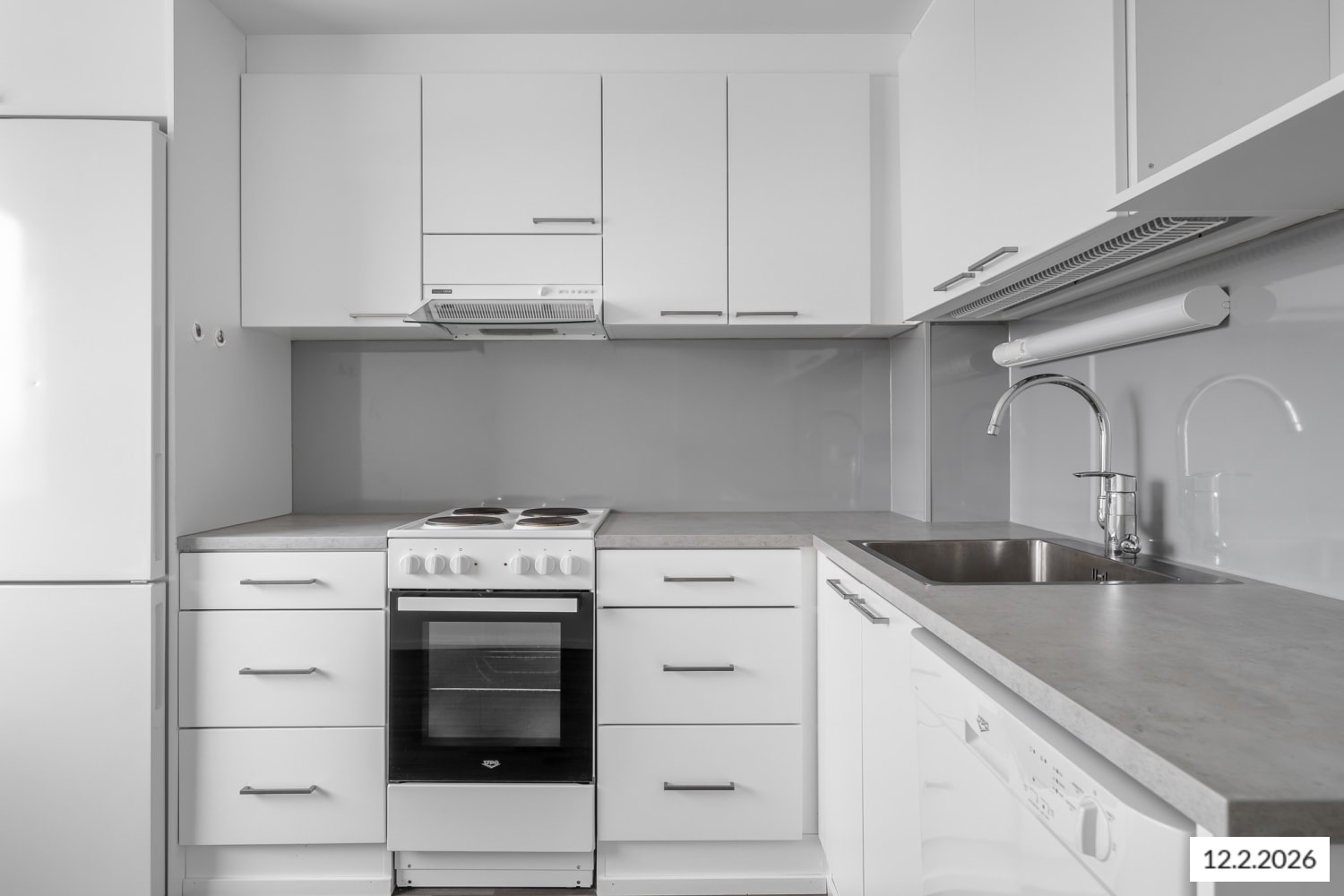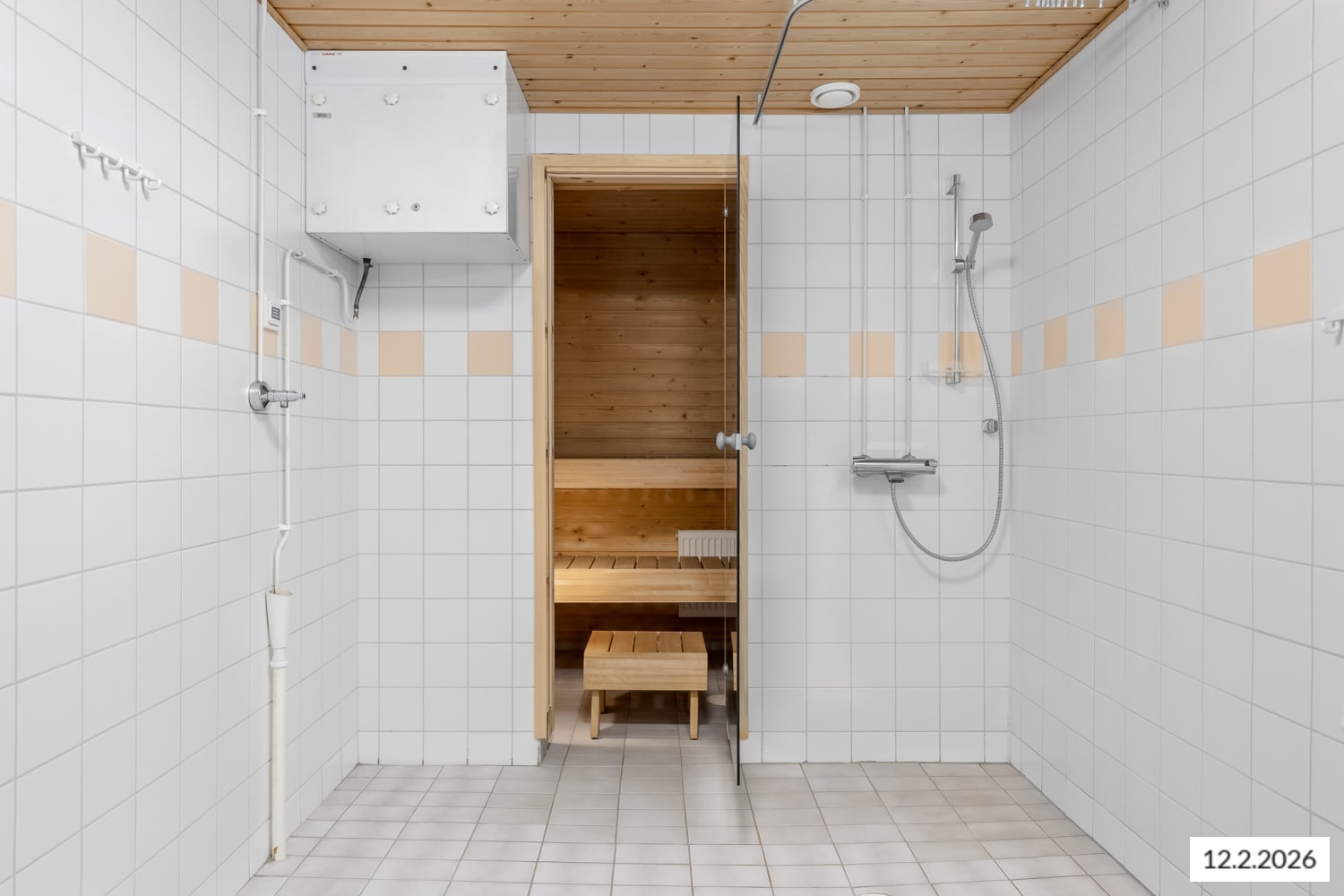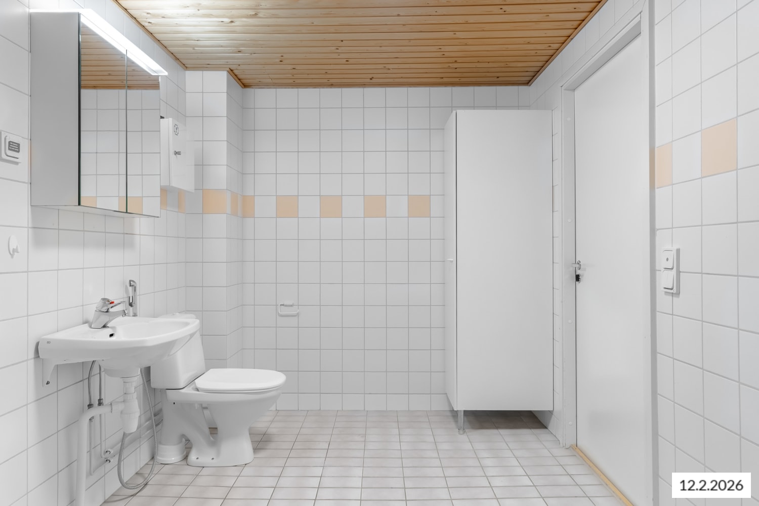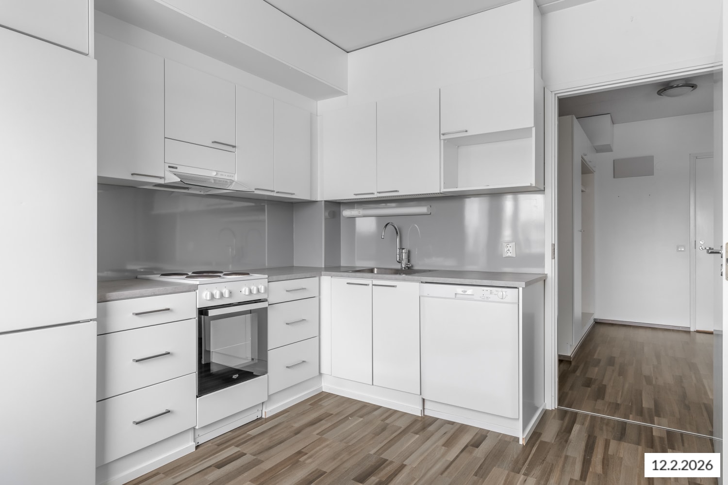 Keittiössä on vaaleat kalusteet ja varusteena astianpesukone, jääkaappipakastin, liesi ja liesituuletin. Laatoitetussa kylpyhuoneessa on tilaa pyykinpesukoneelle.