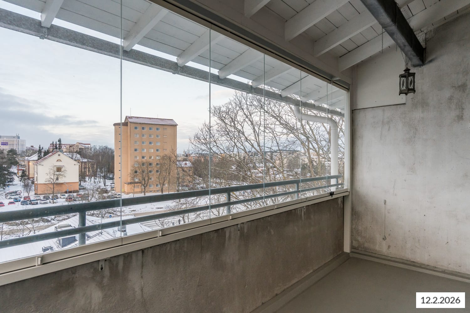 Kodikkaassa kaksiossa on tilava lasitettu parveke, jolla voit nauttia aamukahvit ylimmän kerroksen näkymiä ihaillen. Omassa saunassa rentoudut kiireisen päivän päätteeksi.