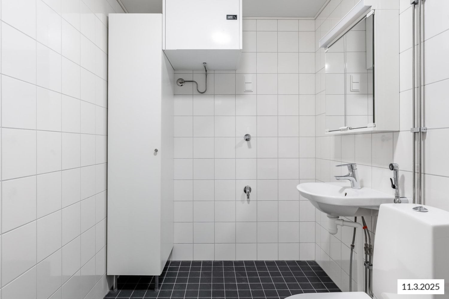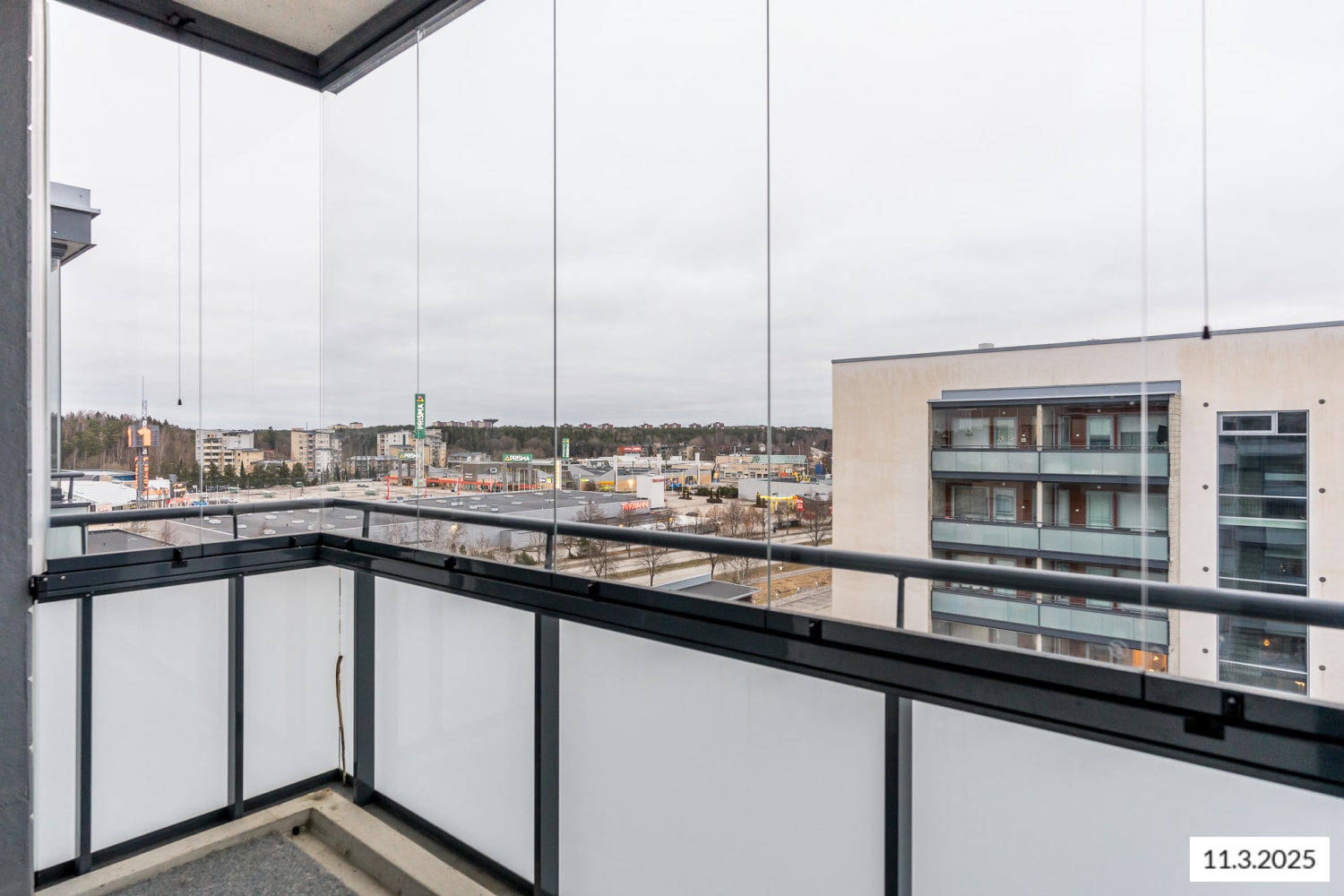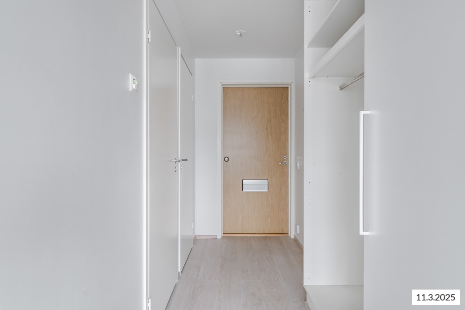 Valoisan yksiön keittiötilat yhdistyvät oleskelutiloihin, jotka on helppo kalustaa mieleiseksi. Ruokapöytä sopii kodikkaasti ikkunan alle ja rauhallinen nukkumapaikka on erotettu eteisestä kaapistolla. Säilytystilaa löytyy eteisen vaatehuoneesta. Lasitetulla parvekkeella kelpaa nauttia aamukahvit.