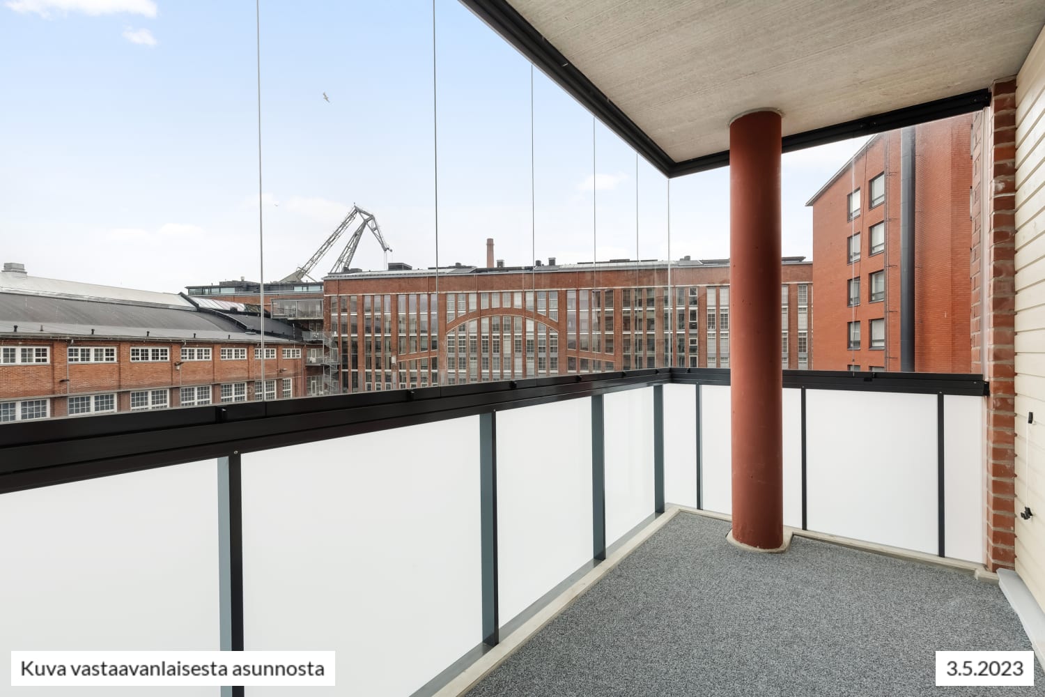 Moderni ja nykyaikainen pohjaratkaisu tekee kaksiosta viihtyisän ja helposti kalustettavan. Ylimmän kerroksen lasitetulla parvekkeella kelpaa nauttia aamukahvit.