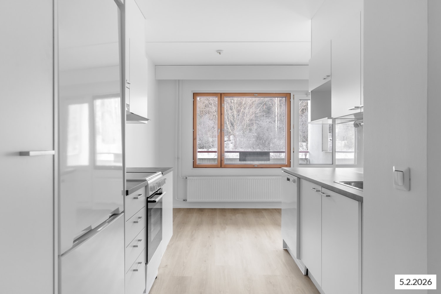 Keittiössä on tilaa sekä kokkailulle että ruokailulle. Kylpyhuoneessa on paikka pyykinpesukoneellesi.