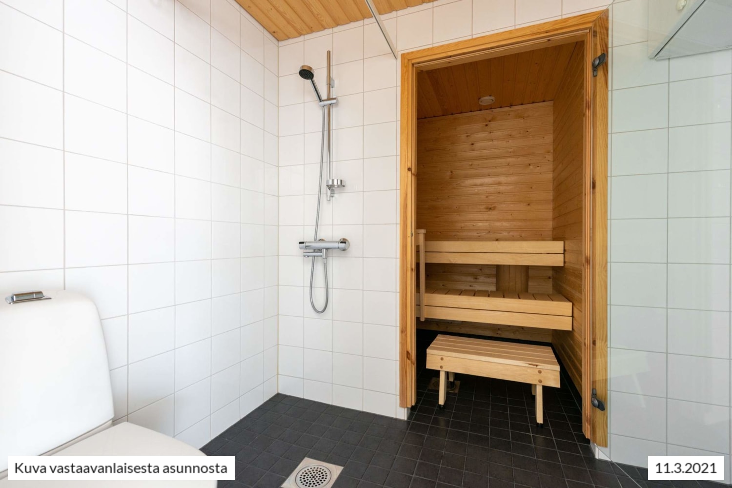 Laatoitetuissa kylpyhuoneissa on varaus pesutornille, ja osassa huoneistoista on oma sauna.