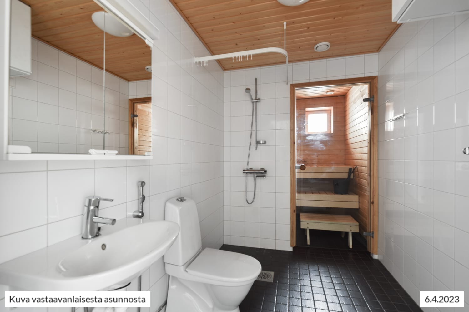 Kylpyhuoneen yhteydessä on oma sauna, johon pääset rentoutumaan oman aikataulusi mukaan. Pesutornille on myös paikka.