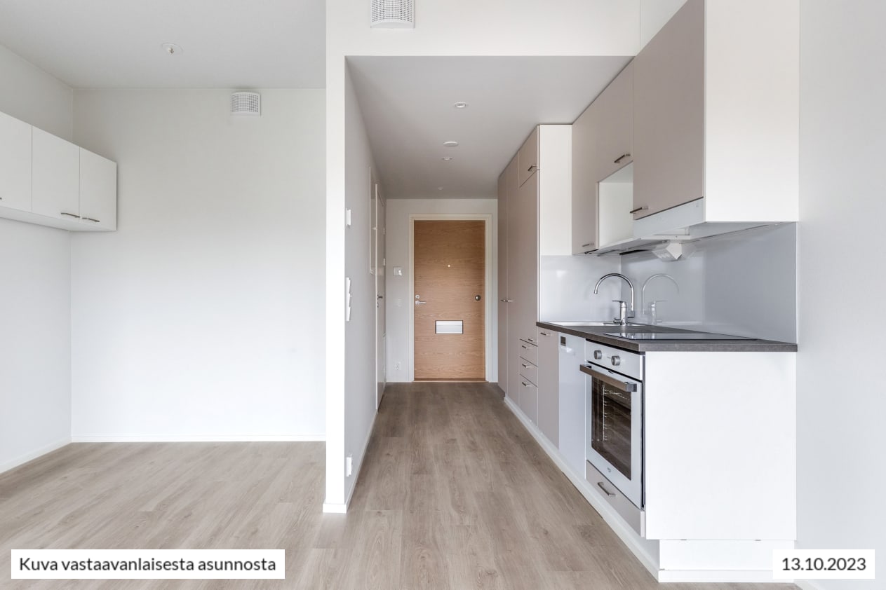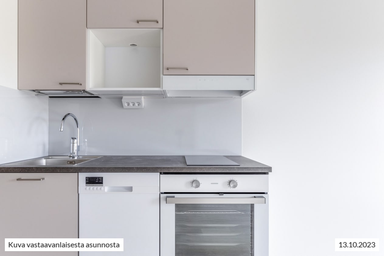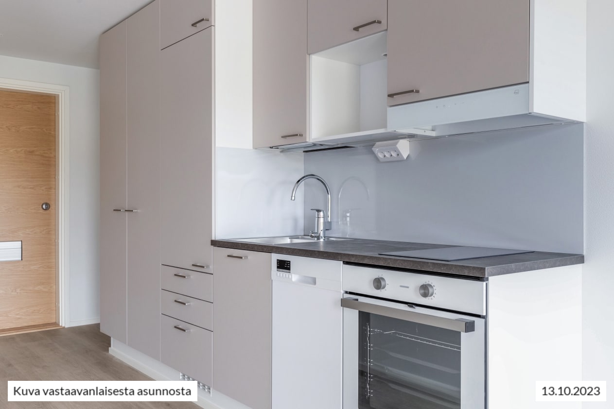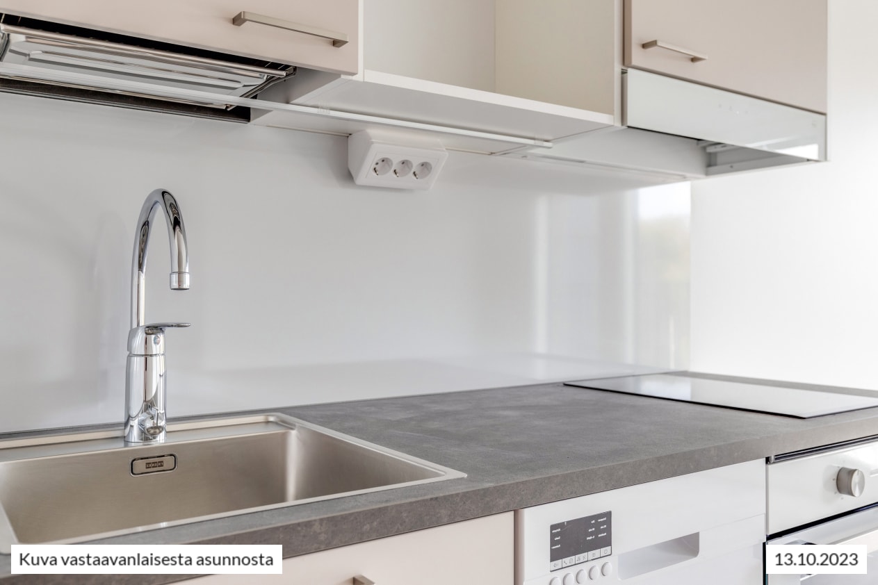 Näppärä keittiö on laadukkaasti varusteltu: kotikokin iloksi tilassa on induktioliesi, kalusteuuni, jääkaappipakastin ja tiskikone. Jopa mikrolle on oma paikkansa. Hiekansävyiset kaapinovet sointuvat kauniisti vaaleaan tammilaminaattilattiaan.