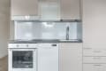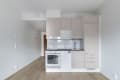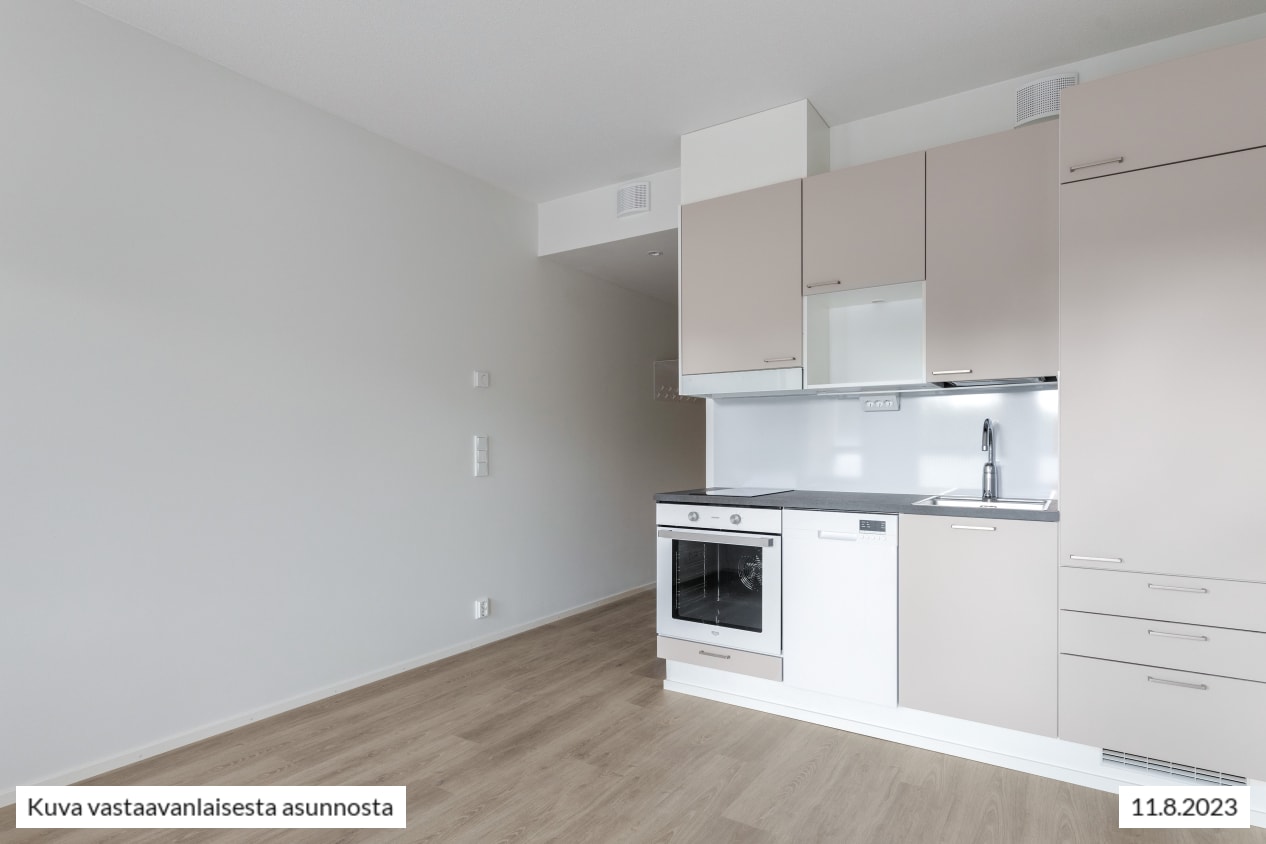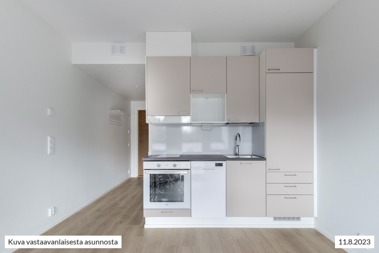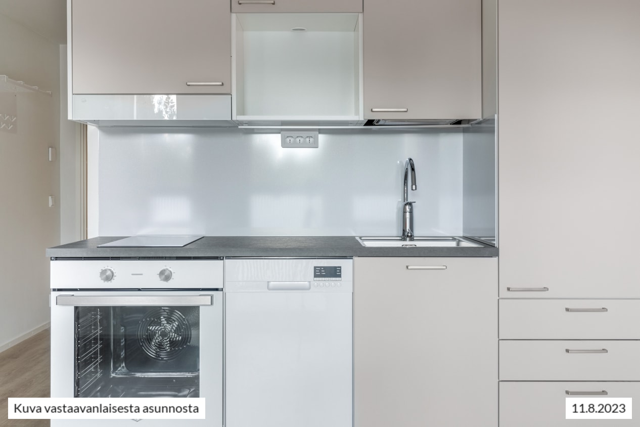 Näppärä keittiö on laadukkaasti varusteltu: kotikokin iloksi tilassa on induktioliesi, kalusteuuni, jääkaappipakastin ja tiskikone. Jopa mikrolle on oma paikkansa. Hiekansävyiset kaapinovet sointuvat kauniisti vaaleaan tammilaminaattilattiaan.