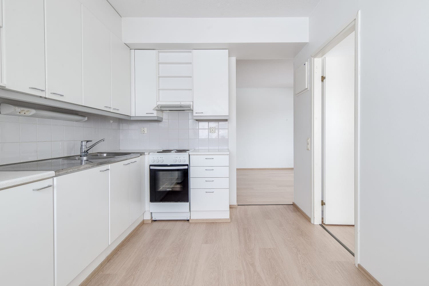 Asuinhuoneiden lattiamateriaalina on laminaatti. Erillisessä keittiössä kotikokki mahtuu puuhailemaan, ja sinne mahtuu myös ruokapöytä viihtyisästi ikkunan ääreen. Keittiön kaapistot ovat raikkaan valkoiset ja ylä- ja alakaappien välinen tila on laatoitettu valkoisilla laatoilla. Varustukseen kuuluu liesi ja jää-pakastinkaappi, tilavaraus löytyy mikroaaltouunille.