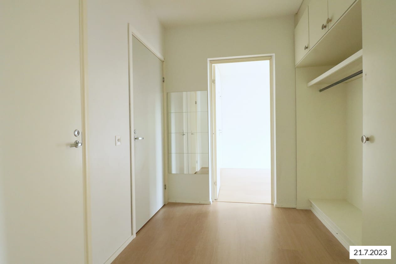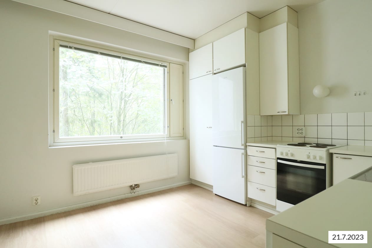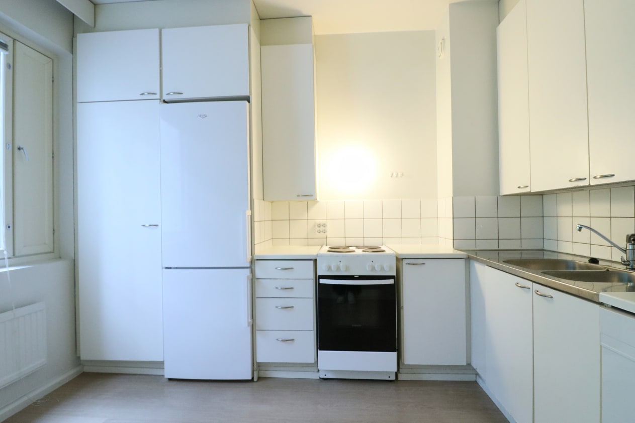 Raikkaan valkoisen keittiön varustukseen kuuluu pyykinpesukone, jääkaappipakastin, lattiauuni sekä perinteinen liesi. Raikkaasta ilmasta saa nauttia kaikessa rauhassa kodin parvekkeella, josta avautuu vehreät maisemat. Kylpyhuoneen seinät on laatoitettu ja omaa tilavarauksen astianpesukoneelle. Olisiko tässä uusi vuokrakotisi?