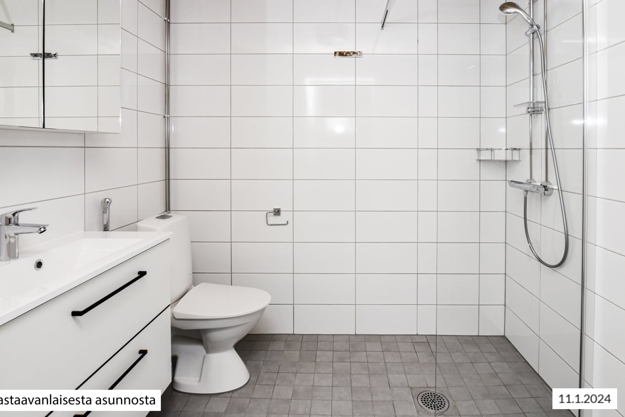 Raikkaassa pesuhuoneessa on tilaa rentoutua ja nauttia kylpyhetkistä. Valkoisilla kaakeleilla kaakeloidut seinät ja harmaa lattialaatta luovat tyylikkään ympäristön. Kotimaiset, kestävät Kide-kylpyhuonekalusteet ovat valkoiset. Täältä löydät myös paikan ja valmiit liitännät sekä pyykinpesukoneelle että kuivausrummulle.