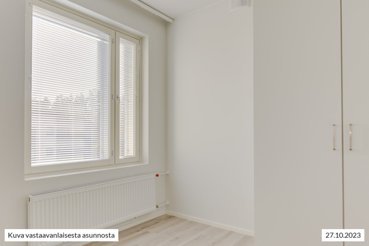Valoisan ja avaran kulmahuoneiston harmoninen värimaailma antaa neutraalin pohjan omalle tyylillesi. Kolmion lasitettu parveke avautuu koilliseen kohti Rykmentinpuiston aluetta ja toisen sivun ikkunat talojen väliselle pihalle. Säilytystilaa vaatteille on sekä eteisessä että makuuhuoneissa.