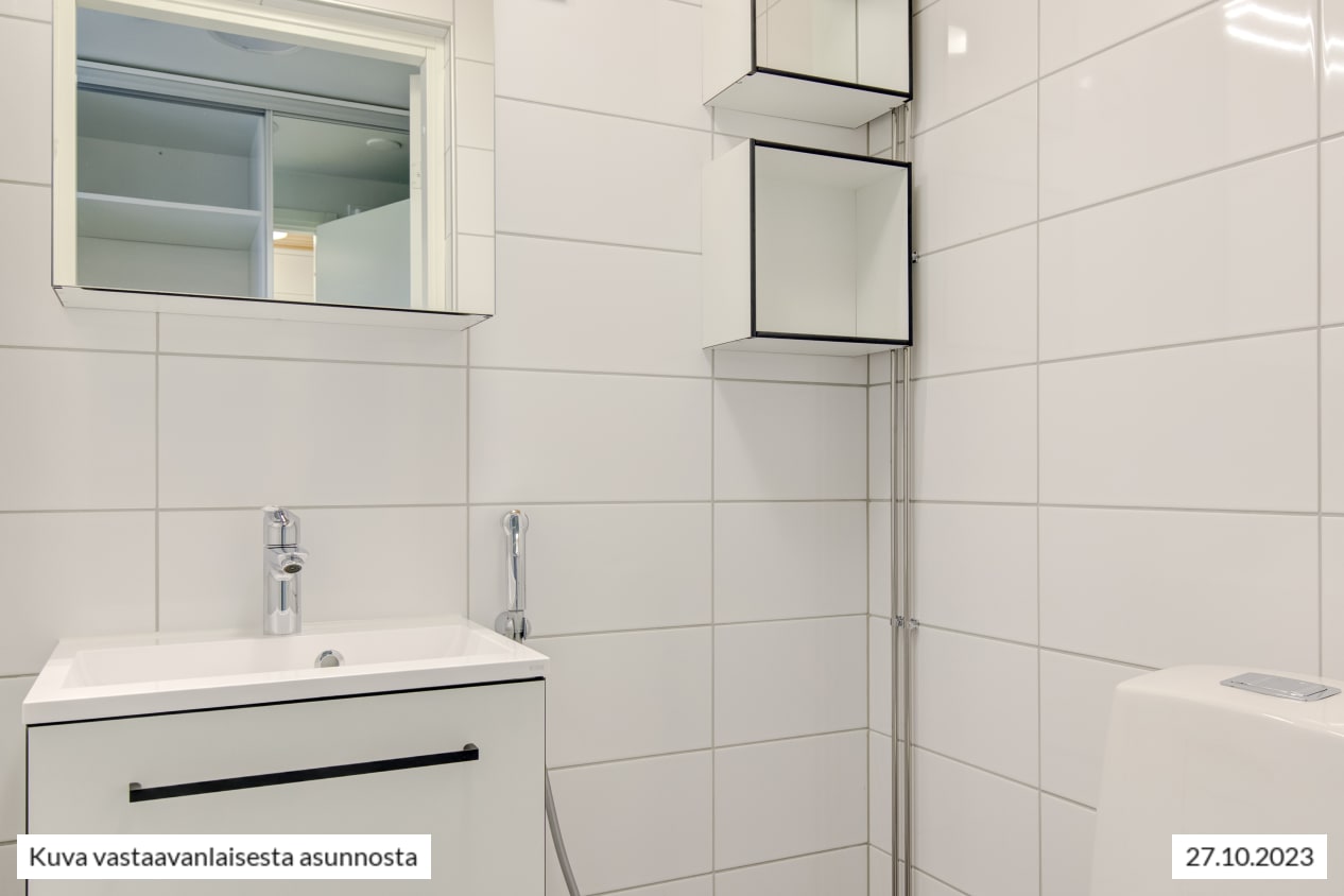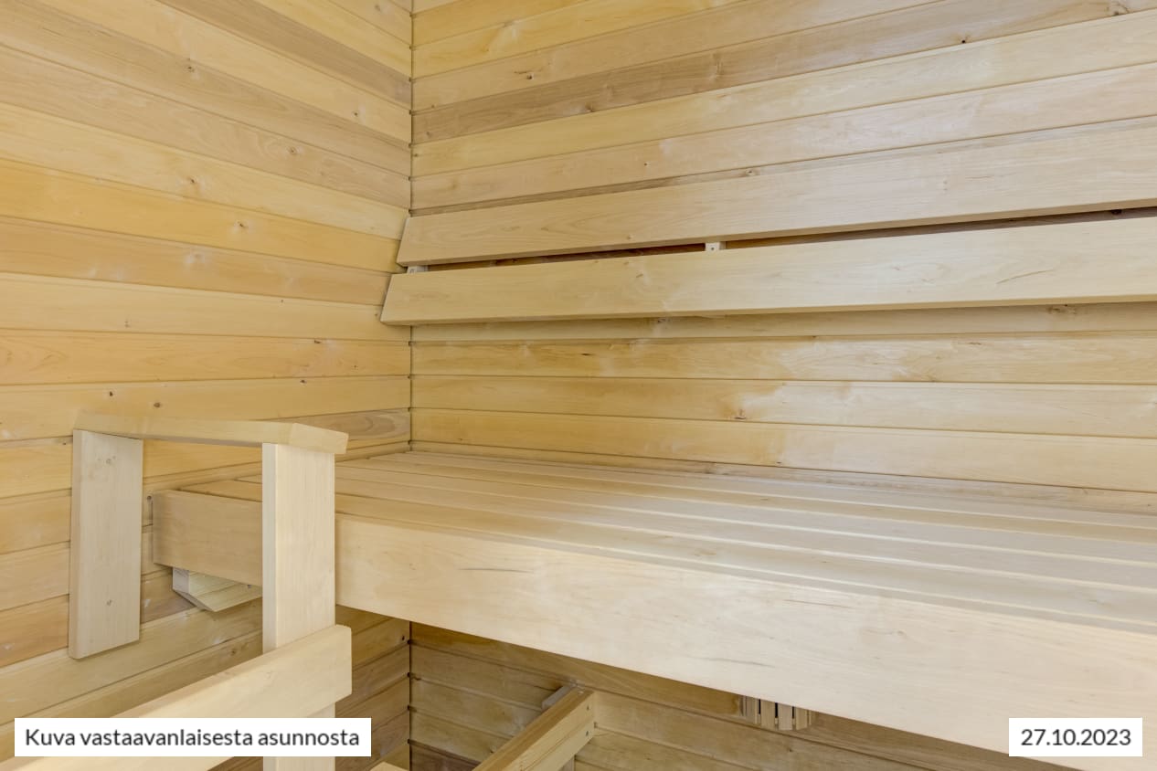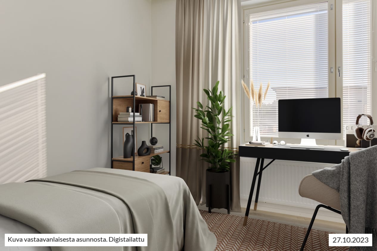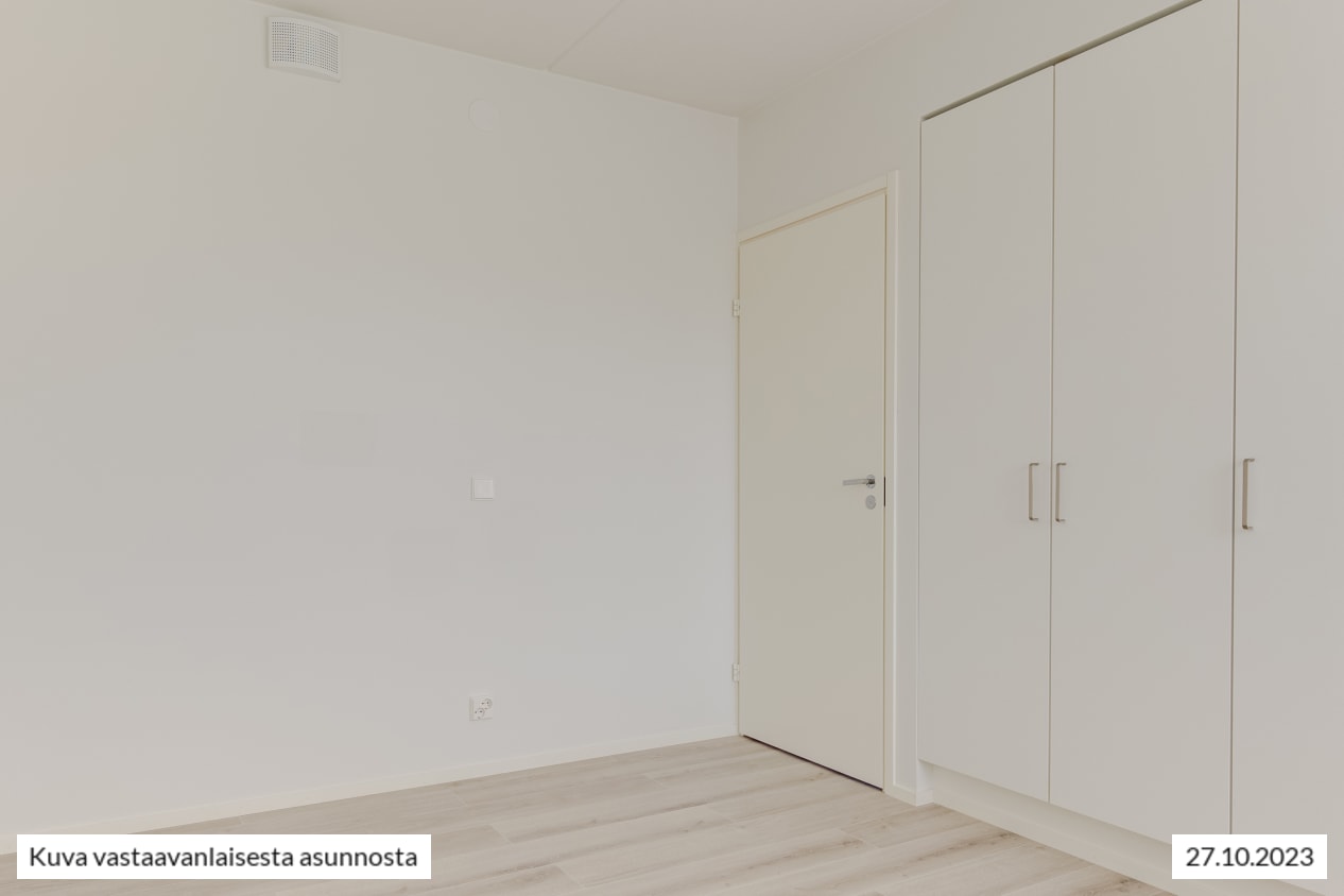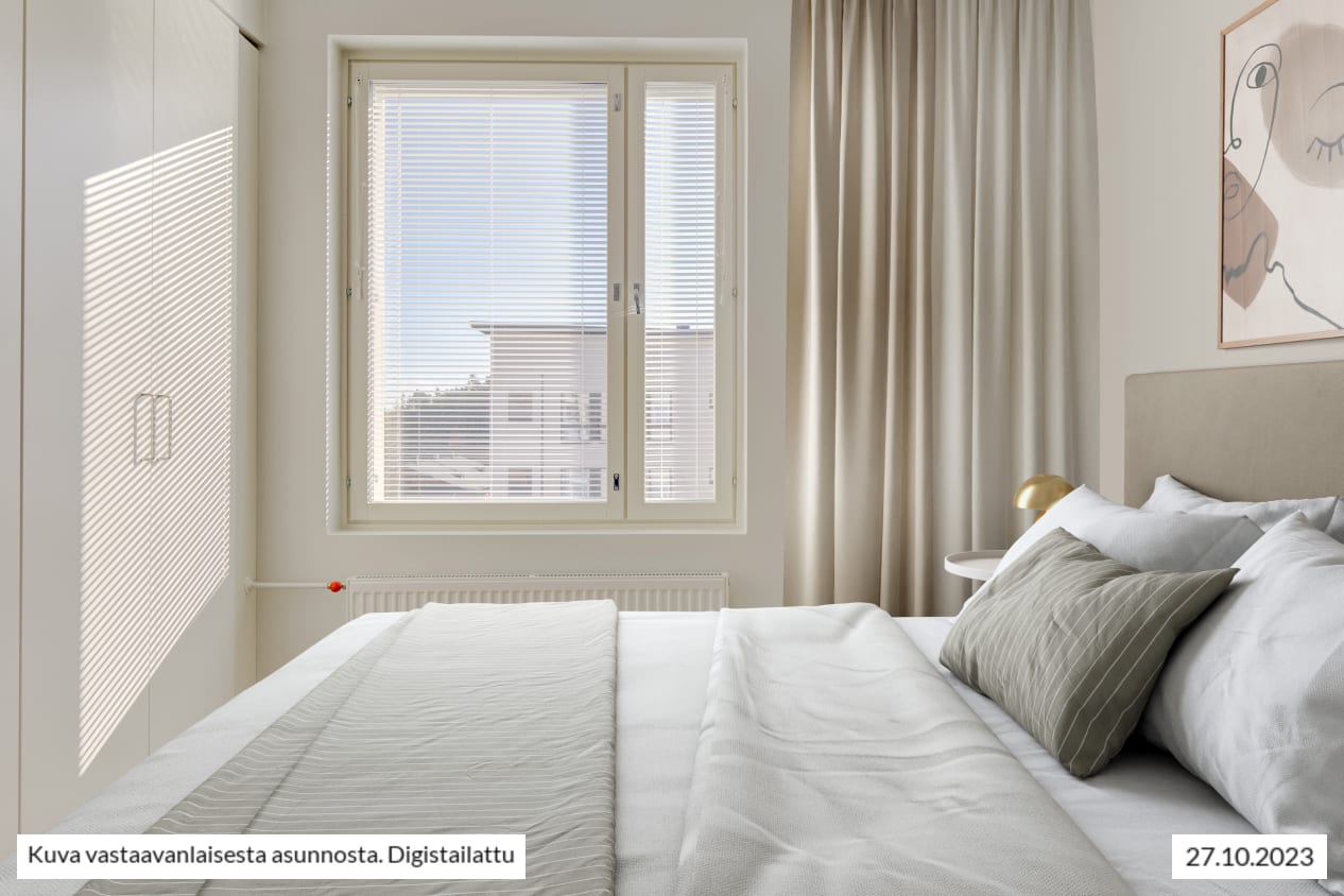 Valoisan kulmahuoneiston harmoninen värimaailma antaa neutraalin pohjan omalle tyylillesi. Säilytystilaa vaatteille on sekä eteisessä että makuuhuoneissa. Kolmion lasitettu parveke avautuu kaakkoon kohti sisäpihan metsäaluetta ja toisen sivun ikkunat lounaaseen talojen väliselle pihalle.