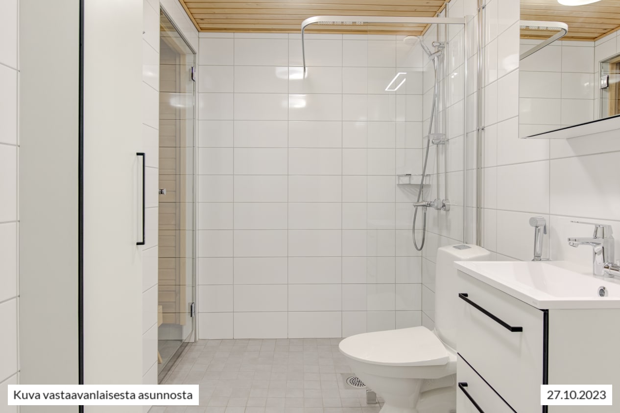 Raikkaassa pesuhuoneessa on tilaa rentoutua ja nauttia kylpyhetkistä. Valkoisilla kaakeleilla kaakeloidut seinät ja harmaa lattialaatta luovat tyylikkään ympäristön. Kotimaiset, kestävät Kide-kylpyhuonekalusteet ovat valkoiset. Täältä löydät myös paikan ja valmiit liitännät sekä pyykinpesukoneelle että kuivausrummulle.