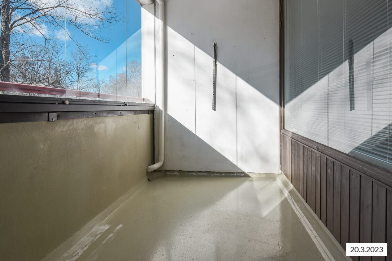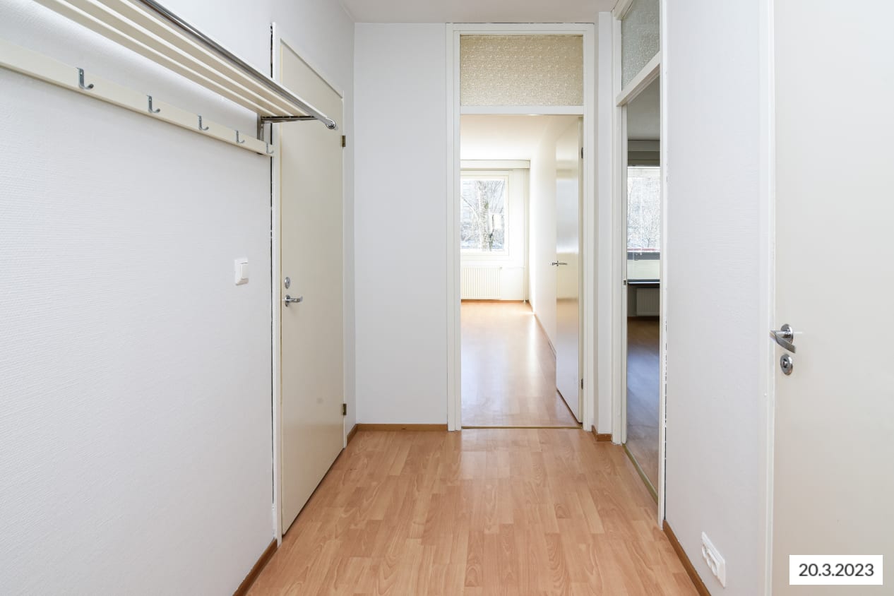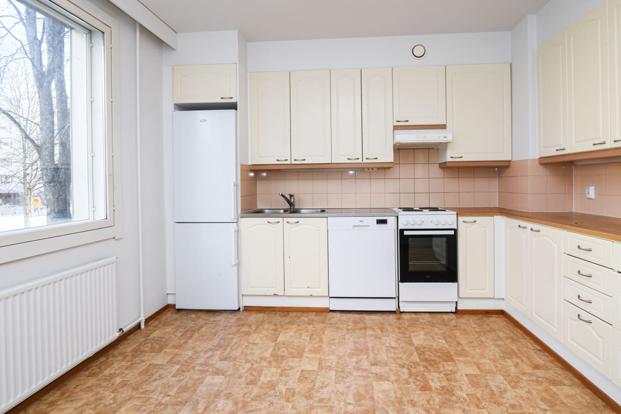 Asuinhuoneiden lattiamateriaalina on laminaatti. Kylpyhuoneet on kaakeloitu. Siisteissä keittiöissä on vaniljan sävyiset kaapistot.