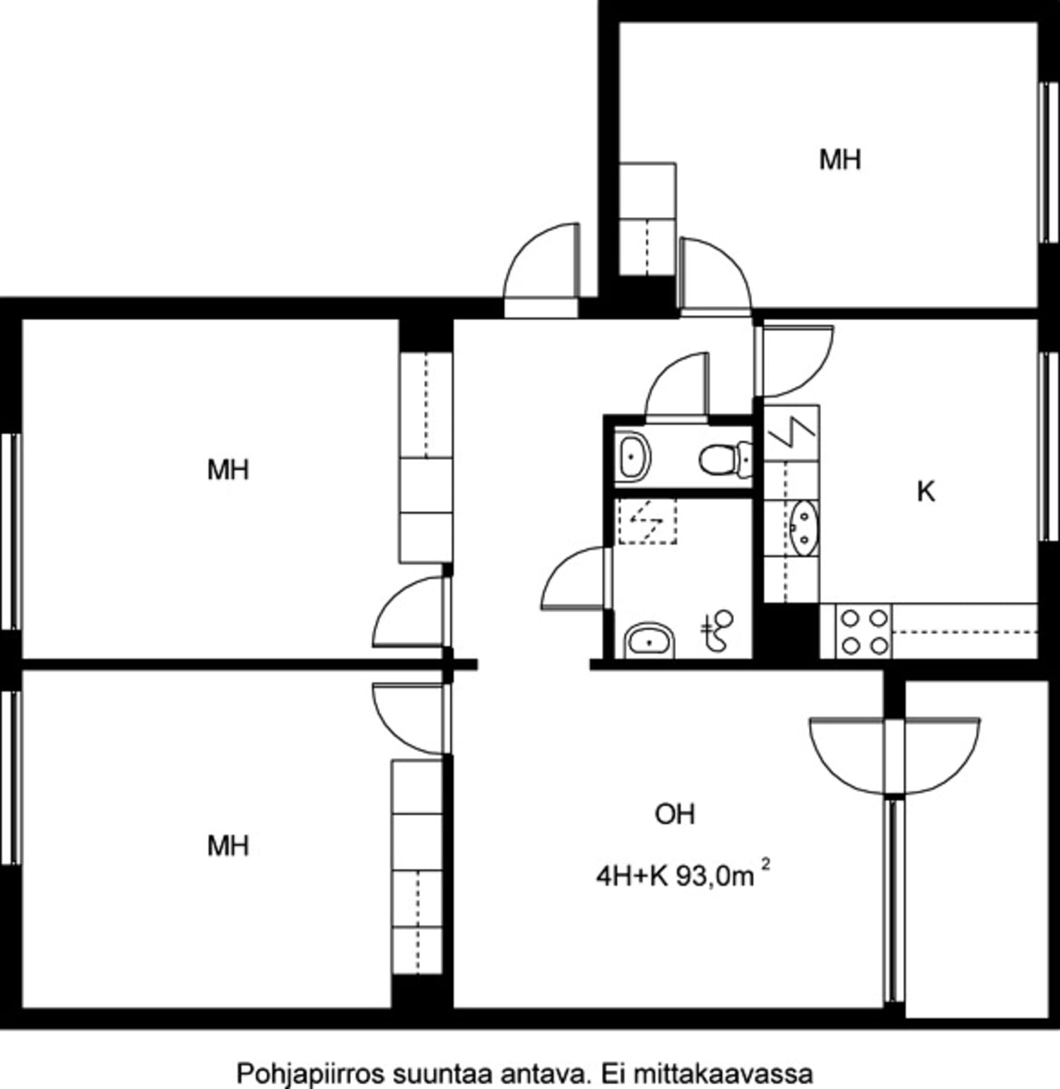 Keittiössä on jää-pakastinkaappi, tilavaraus astianpesukoneelle ja 4-levyinen liesi. Kylpyhuone on osittain kaakeloitu.