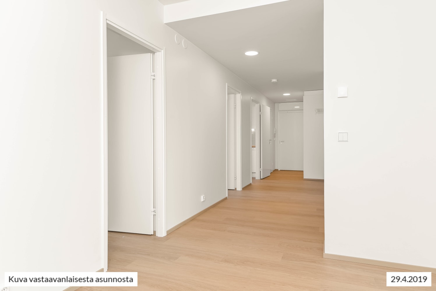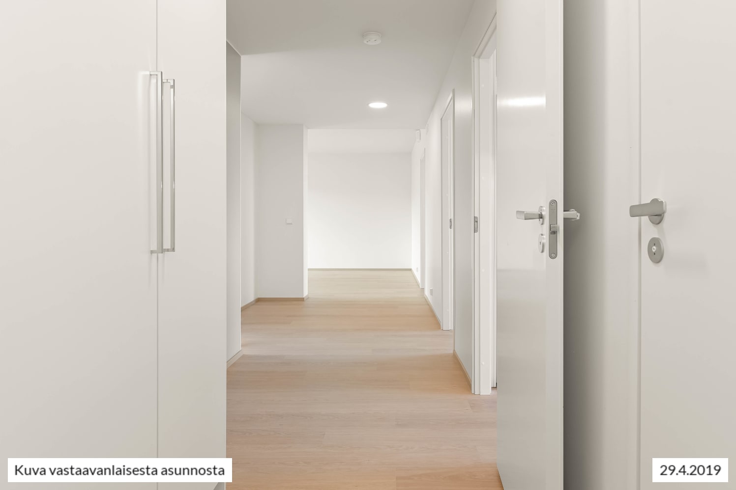 Kodin lattiat ovat vaaleaa tammilankkua mukailevaa laminaattia. Seinät ovat valkoisia lukuun ottamatta eteisen naulakon taustalla olevaa harmaata tehosteseinää. Eteisen ja makuuhuoneiden komerot ovat valkoisia ja ikkunoissa on sälekaihtimet. Keittiön kalusteet ovat valkoiset ja ylä- ja alakaappien välisessä tilassa on vaalean harmaa laatoitus. Työtaso on sävyltään vaaleaa laminaattia. Varustukseen kuuluu jääkaappipakastin, astianpesukone, liesi ja liesikupu sekä varaus mikroaaltouunille.