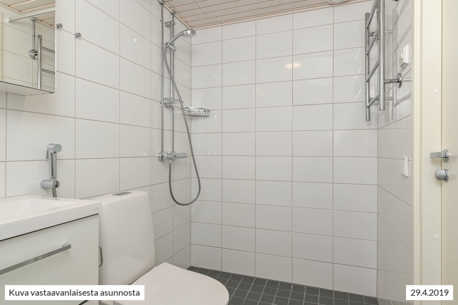 Kylpyhuoneessa kalusteet ovat kotimaista Kide-mallistoa ja niiden materiaali on kestävää ja kaunista valkoista massiivilaminaattia. Kylpyhuoneessa seinät ovat kiiltävän valkoista laattaa ja lattian laatoitus on harmaa. Pesukoneelle ja kuivausrummulle on varaus.