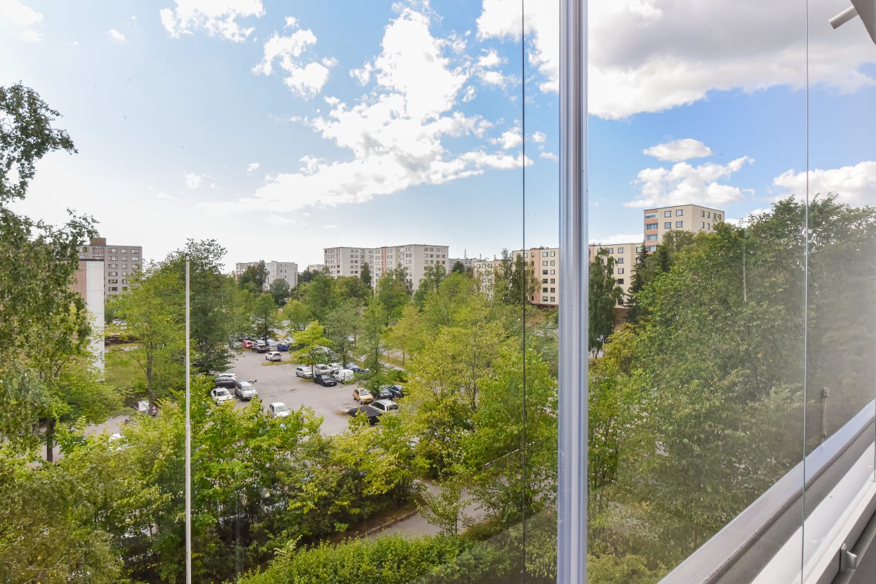 Remontoidun kaksion vaaleat pinnat miellyttävät silmää ja se on helppo kalustaa omaksi kodiksi. Erilliseen keittiöön mahtuu mukavasti sekä kokkailemaan että ruokailemaan. Etelänpuoleinen lasitettu parveke on kesäaikaan kuin lisähuone.