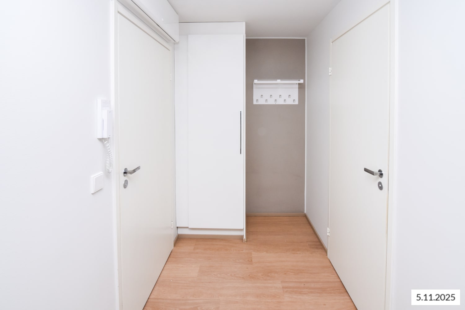 Kodin lattiat ovat vaaleaa tammilankkua mukailevaa laminaattia. Seinät ovat valkoisia lukuun ottamatta eteisen naulakon taustalla olevaa harmaata tehosteseinää. Eteisen ja makuuhuoneiden komerot ovat valkoisia ja ikkunoissa on sälekaihtimet. Keittiön kalusteet ovat valkoiset ja ylä- ja alakaappien välisessä tilassa on vaalean harmaa laatoitus. Työtaso on sävyltään vaaleaa laminaattia. Varustukseen kuuluu jääkaappipakastin, astianpesukone, liesi ja liesikupu sekä varaus mikroaaltouunille.