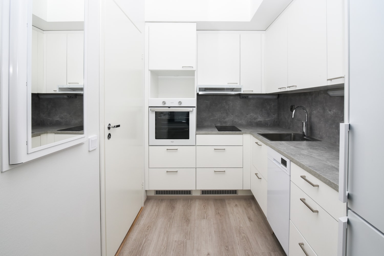 Kodin vaaleat pintamateriaalit antavat neutraalin pohjan omalle tyylillesi. Lattiat ovat vaalean tammensävyistä laminaattia ja seinät on maalattu vaaleiksi. Ikkunoissa on valkoiset sälekaihtimet. Keittiöissä on valkoiset kaapistot, ylä- ja alakaappien välinen tila ja tasot ovat harmaata laminaattia tai rosteria. Täysvarustellussa keittiössä on induktiotaso, kalusteuuni, liesikupu, astianpesukone ja jääkaappipakastin. Mikroaaltouunillekin on tilavaraus. Tässä keittiössä on ilo kokkailla!