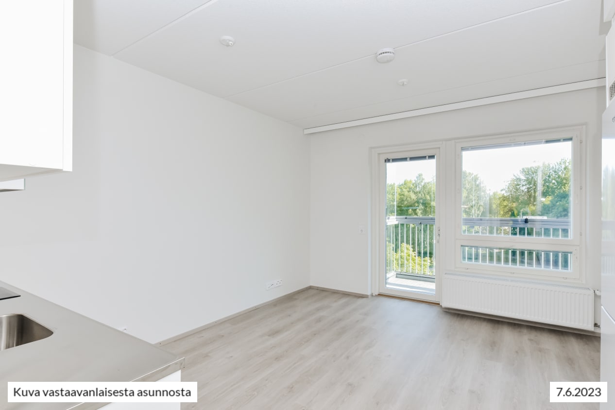 Näkymät näppärästä pikkukodista avautuvat rauhalliselle sisäpihalle. Yksiön vaaleasävyinen keittiö sulautuu saumattomasti oleskelutilaan. Kesällä voit nauttia aamupalaa omalla, lasitetulla parvekkeella kuunnellen linnun laulua ja kotoisia sisäpihan ääniä.