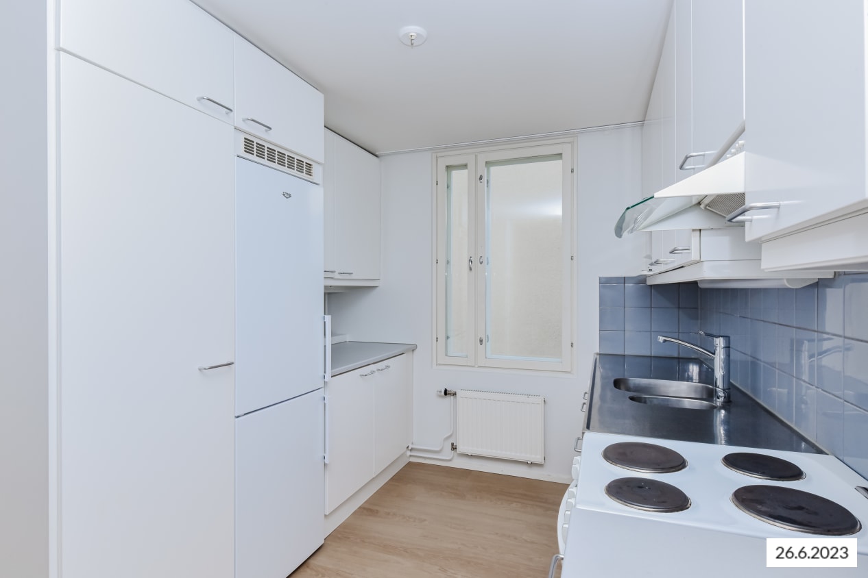 Kolmannen kerroksen kolmion pohjaratkaisu on käytännöllinen ja helposti kalustettava mieleiseksesi. Kesällä oleskelutila jatkuu omalle parvekkeelle. Erillisessä keittiössä on tiskikone, jää-pakastinkaappi ja nelilevyinen liesi, ruokapöytä mahtuu olohuoneen puolelle.