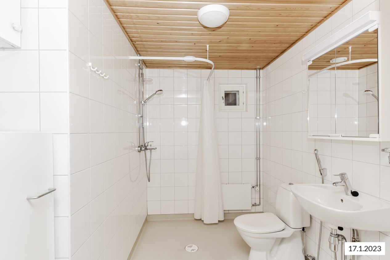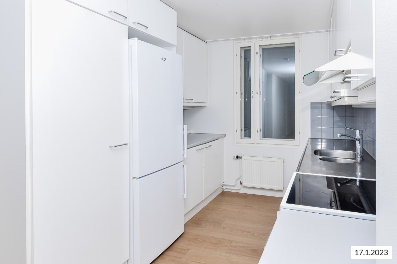 Keittiössä on jääkaappipakastin, lattiauuni ja perinteinen liesi. Tilavassa laatoitetussa kylpyhuoneessa on pesukonetta varten paikka ja liitännät. Olisiko tämä uusi vuokrakotisi?