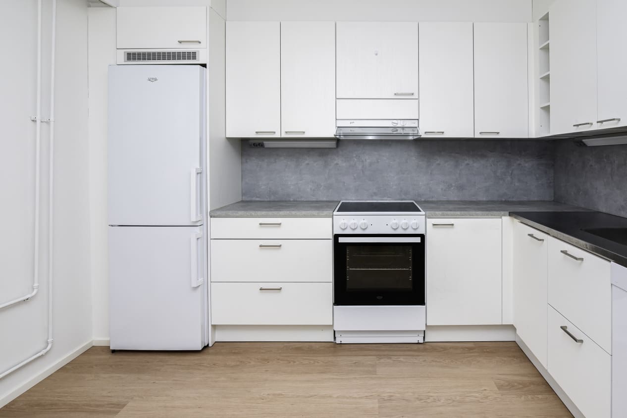 Asunnon sisustus on vaalea ja yleisilmeeltään kodikkaan toimiva. Lattia on tammilaminaattia ja seinät on maalattu valkoisiksi. Keittiössä on valkoiset, puusyykuvioiset kaapistot. Ylä- ja alakaappien välinen tila ja työtaso ovat harmaata laminaattia ja tiskipöytä kuvioitua terästä. Varustukseen kuuluu keraaminen liesi, liesikupu, astianpesukone ja jääkaappipakastin. Kodinkoneet ovat valkoisia. Mikroaaltouunille on tilavaraus. Kylpyhuoneen seinät ovat valkoista laattaa ja lattian laatoituksen sävy on harmaa. Kalusteet ovat vaalean tammen sävyiset ja pyykinpesukoneelle ja kuivausrummulle on paikka.