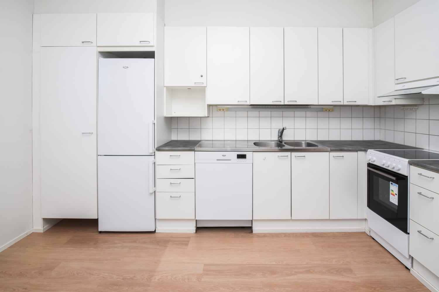 Keittiössä on astianpesukone ja jää-pakastinkaappi sekä tilavaraukset toiselle kylmäkalusteelle ja mikroaaltouunille.