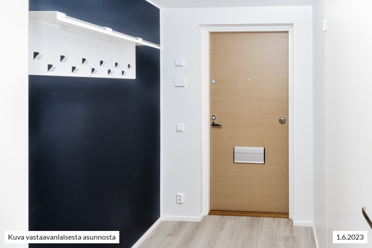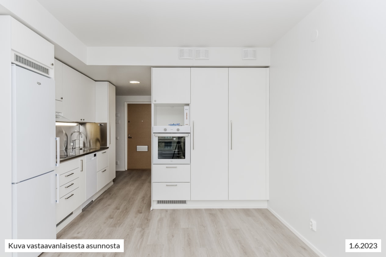 Kodin ajattomat pintamateriaalit luovat neutraalin pohjan persoonalliselle tyylillesi. Lattiat ovat vaalean tammensävyistä laminaattia ja seinät on maalattu vaaleiksi. Ikkunoissa on valkoiset sälekaihtimet. Vaaleasävyinen keittiö sulautuu saumattomasti oleskelutilaan. Ylä- ja alakaappien välinen tila on vaaleaa laminaattia tai rosteria, tasot harmaata laminaattia tai rosteria. Täysvarustellussa keittiössä on induktiotaso, kalusteuuni, liesikupu, astianpesukone ja jääkaappipakastin. Mikroaaltouunillekin on tilavaraus. Tässä keittiössä on ilo kokkailla!