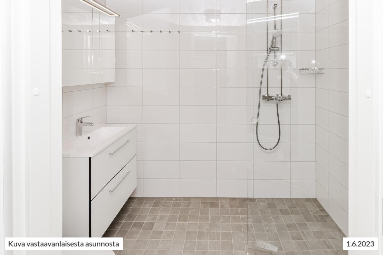 Arjen varma piristys on uutuuttaan hohtava kotikylpylä, jonka seinät ovat valkoista ja lattia harmaata laattaa. Tehopohjaisessa kylpyhuoneessa on tilaa myös pyykkikoneellesi.