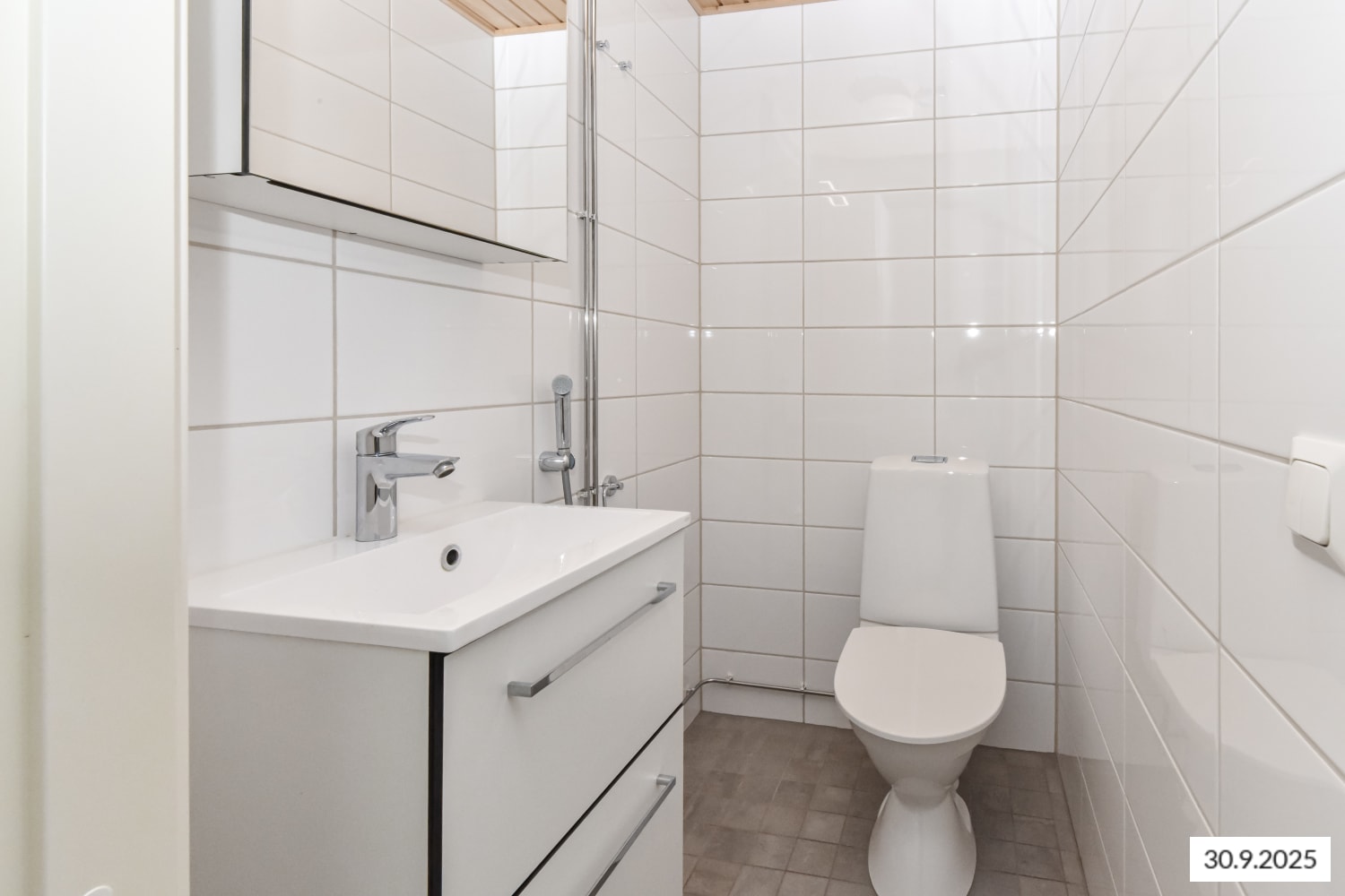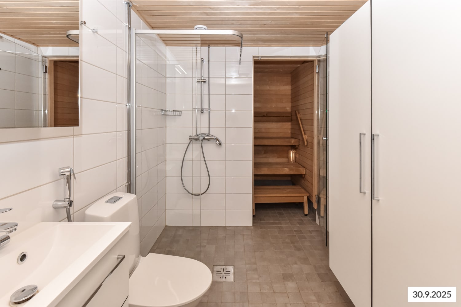 Arjen varma piristys on uutuuttaan hohtava kotikylpylä, jonka seinät ovat valkoista ja lattia harmaata laattaa. Tehopohjaisessa kylpyhuoneessa on tilaa myös pyykkikoneellesi. Pyykkien lajittelu ja säilytys hoituu näppärästi pyykkikaapin ansiosta.