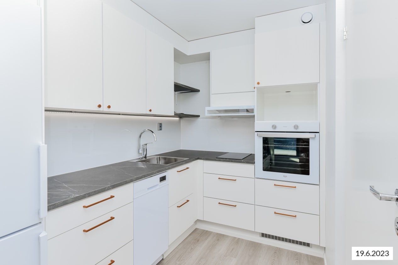 Kodin ajattomat pintamateriaalit luovat neutraalin pohjan persoonalliselle tyylillesi. Lattiat ovat vaalean tammensävyistä laminaattia ja seinät on maalattu vaaleiksi. Ikkunoissa on valkoiset sälekaihtimet. Tasokkaassa keittiössä on valkoiset kaapistot ja niissä kuparinväriset, yksinkertaiset vetimet. Ylä- ja alakaappien välinen tila on vaaleaa laminaattia tai rosteria, tasot harmaata laminaattia. Täysvarustellussa keittiössä on induktiotaso, kalusteuuni, liesikupu, astianpesukone ja jääkaappipakastin. Mikroaaltouunillekin on tilavaraus. Tässä keittiössä on ilo kokkailla!