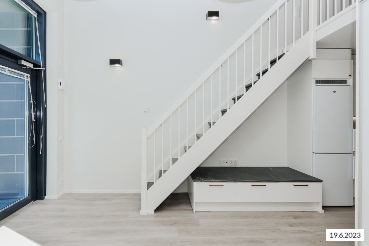 Koti avaraa tilaa arvostavalle! Valoisa, loftmainen yksiö sopii sekä asumiseen että yritystoimintaan. Oleskelualueen huonekorkeus on reilusti yli kolme metriä. Keittiö on hieman erillään olohuoneesta. Keittiötilan yläpuolella on parvi, joka sopii säilytystilaksi tai vaikkapa nukkumiseen. Parvelle vievien rappujen alla oleva tila on hyödynnetty rakentamalla sinne tunnelmallinen penkki, jonka alla on myös säilytystilaa. Näkymät sympaattisesta pikkukodista avautuvat Lincolninaukiolle. Autoiletko? Lincolninaukion kaikilla autopaikoilla on sähköauton latausmahdollisuus.