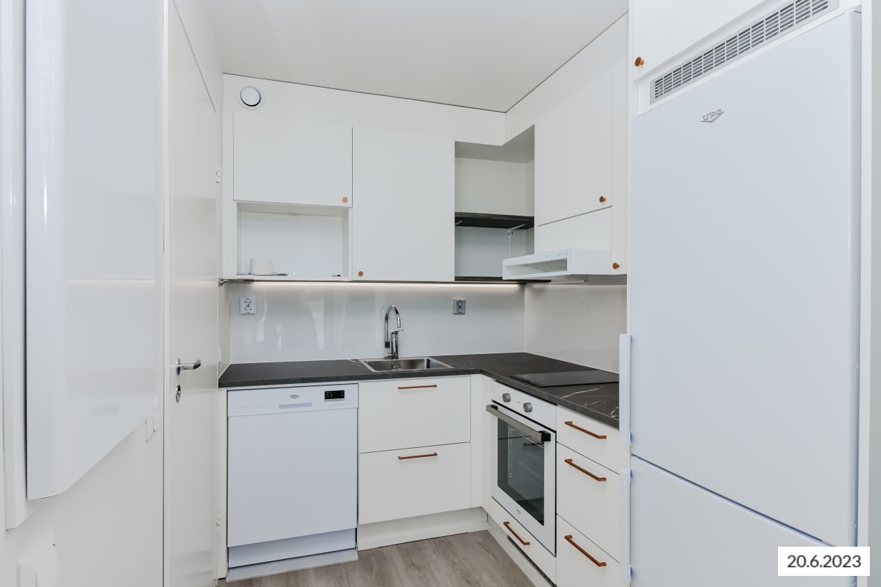 Kodin ajattomat pintamateriaalit luovat neutraalin pohjan persoonalliselle tyylillesi. Lattiat ovat vaalean tammensävyistä laminaattia ja seinät on maalattu vaaleiksi. Ikkunoissa on valkoiset sälekaihtimet. Tasokkaassa keittiössä on valkoiset kaapistot ja niissä kuparinväriset, yksinkertaiset vetimet. Ylä- ja alakaappien välinen tila on vaaleaa laminaattia tai rosteria, tasot harmaata laminaattia. Täysvarustellussa keittiössä on induktiotaso, kalusteuuni, liesikupu, astianpesukone ja jääkaappipakastin. Mikroaaltouunillekin on tilavaraus. Tässä keittiössä on ilo kokkailla!