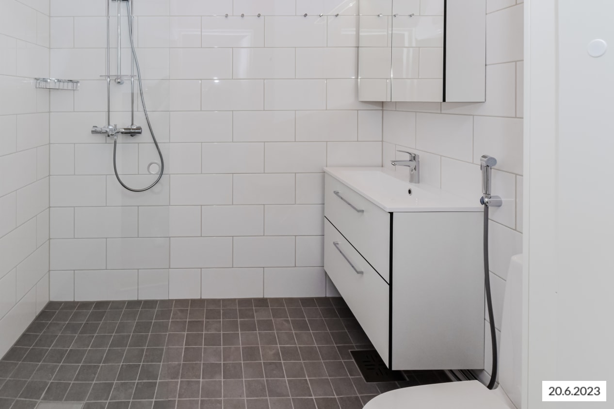Arjen varma piristys on uutuuttaan hohtava kotikylpylä, jonka seinät ovat valkoista ja lattia harmaata laattaa. Tehopohjaisessa kylpyhuoneessa on tilaa myös pyykkikoneellesi.