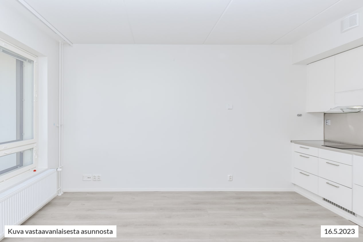 Kodin ajattomat pintamateriaalit luovat neutraalin pohjan persoonalliselle tyylillesi. Lattiat ovat vaalean tammensävyistä laminaattia ja seinät on maalattu vaaleiksi. Ikkunoissa on valkoiset sälekaihtimet. Vaaleasävyinen keittiö sulautuu saumattomasti oleskelutilaan. Ylä- ja alakaappien välinen tila on vaaleaa laminaattia tai rosteria, tasot harmaata laminaattia tai rosteria. Täysvarustellussa keittiössä on induktiotaso, kalusteuuni, liesikupu, astianpesukone ja jääkaappipakastin. Mikroaaltouunillekin on tilavaraus. Tässä keittiössä on ilo kokkailla!