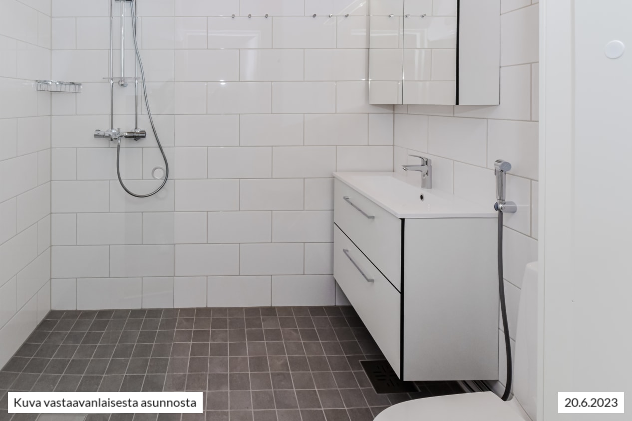 Arjen varma piristys on uutuuttaan hohtava kotikylpylä, jonka seinät ovat valkoista ja lattia harmaata laattaa. Tehopohjaisessa kylpyhuoneessa on tilaa myös pyykkikoneellesi.