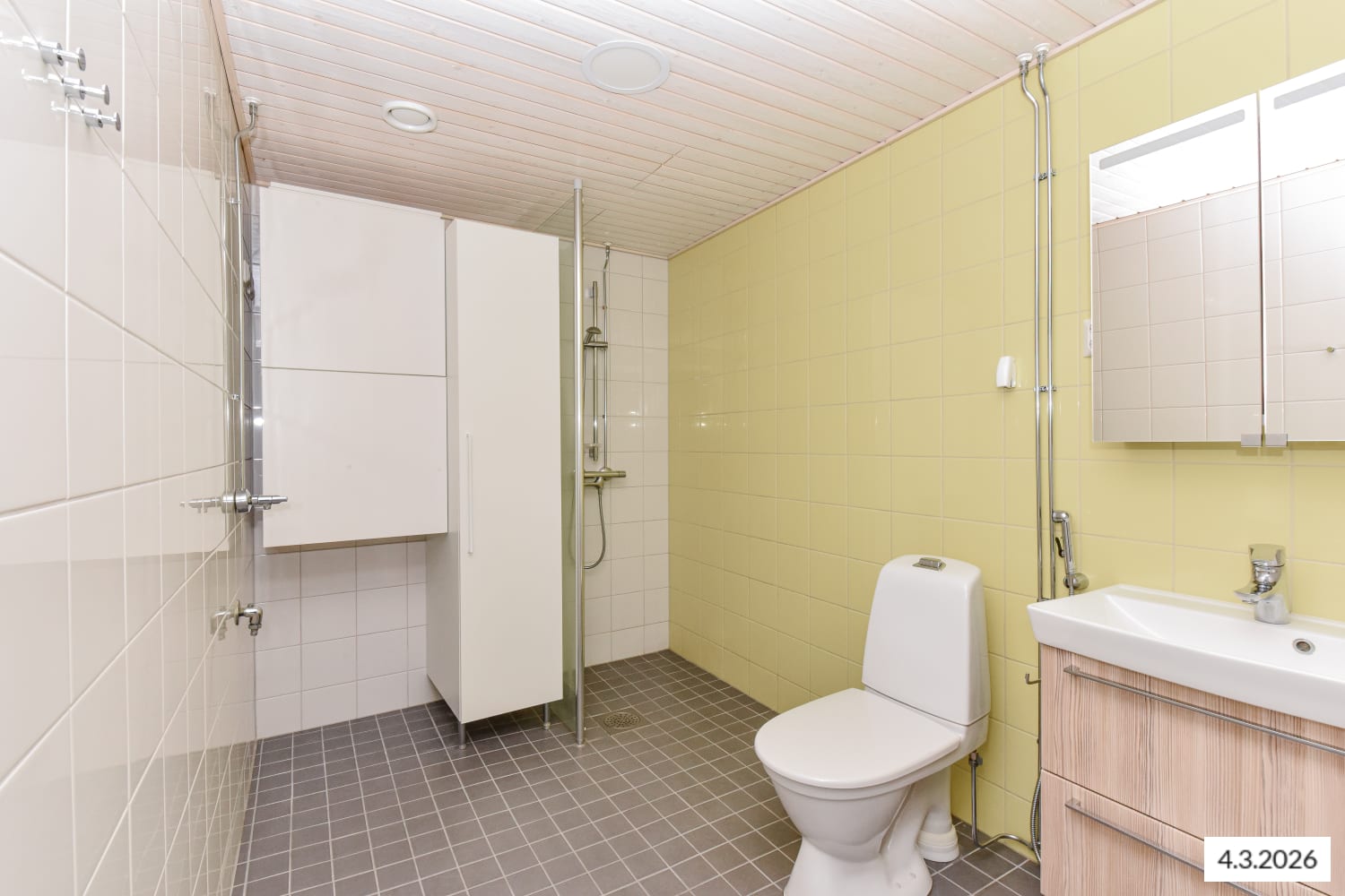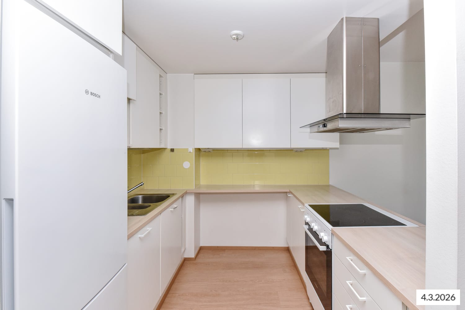 Asuintilojen lattiat ovat tumman harmaata tammilaminaattia. Keittiön kaapistojen ovet ovat raikkaan valkoiset ja ylä- ja alakaappien välinen tila on laatoitettu vaalealla, veden vihreällä laatalla. Työtaso on mustaa kiveä mukailevaa laminaattia. Varustukseen kuuluu keraaminen liesi, astianpesukone ja kylmälaitteet. Kokonaan laatoitetun kylpyhuoneen lattia on antrasiitin sävyistä klinkkeriä ja vaaleita seiniä elävöittää veden vihreä tehosteseinä. Pesukoneelle ja kuivausrummulle on tilavaraus.