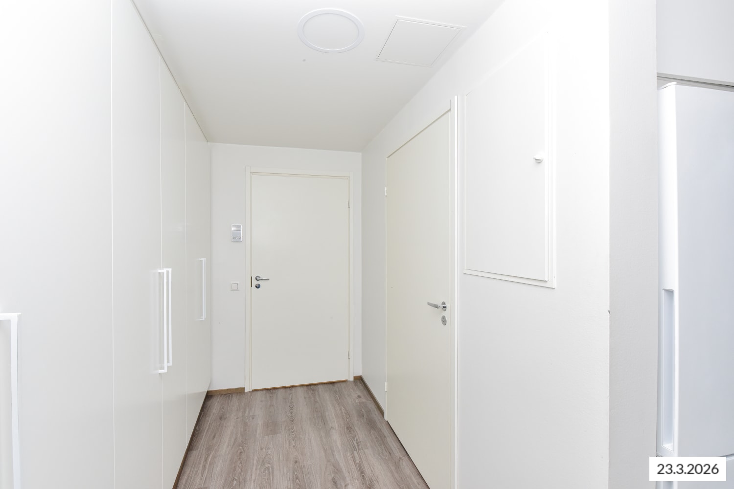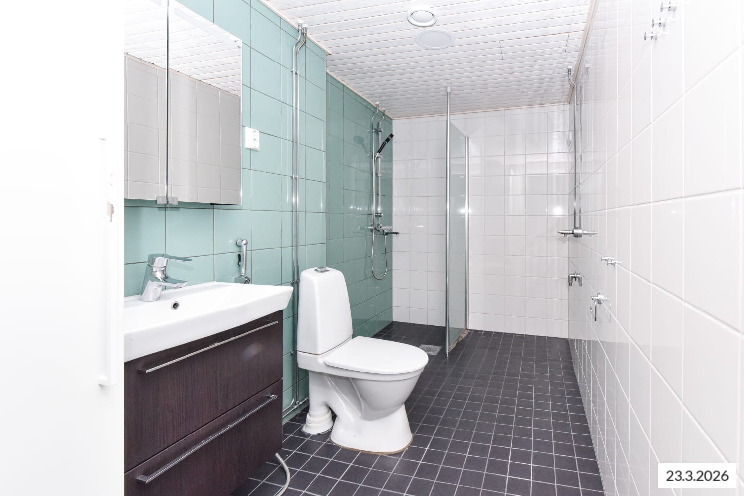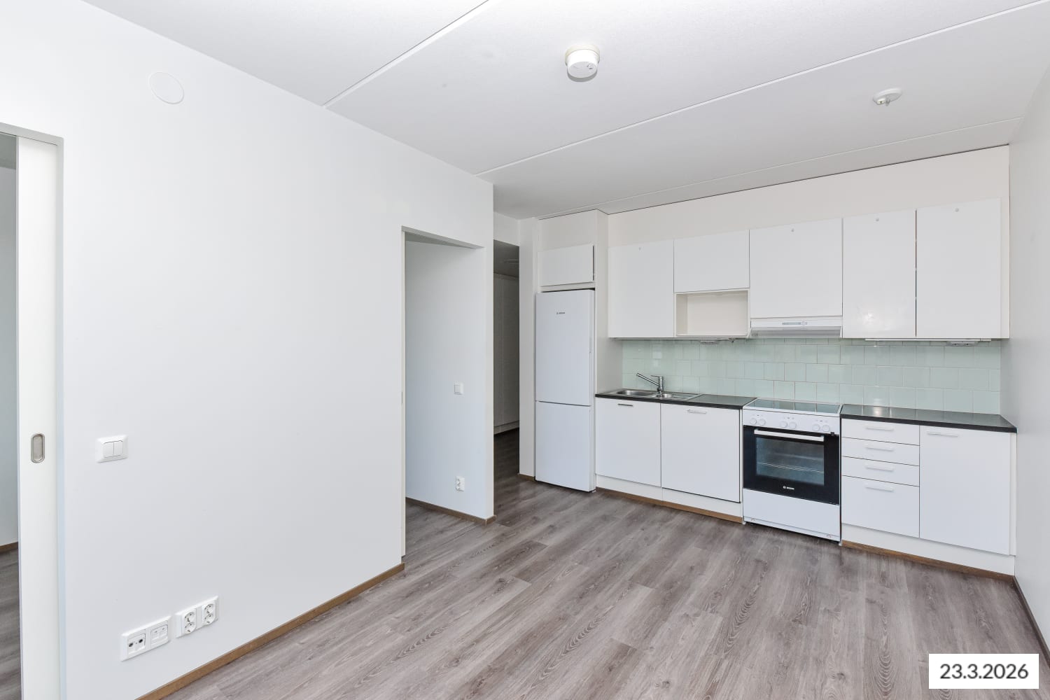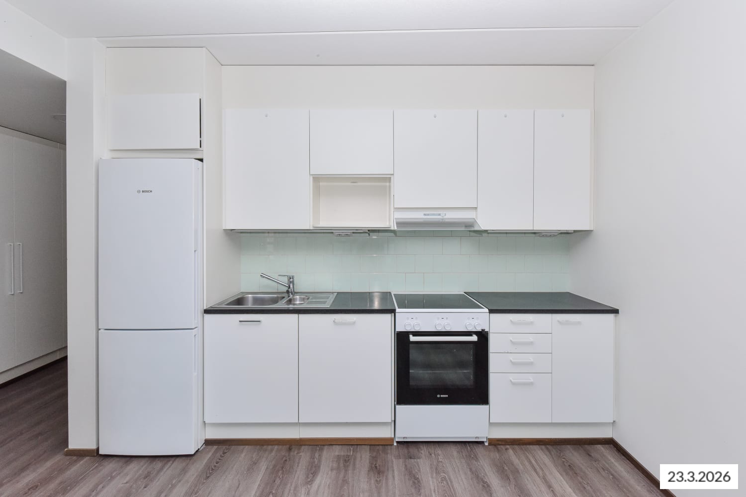 Asuintilojen lattiat ovat tumman harmaata tammilaminaattia. Keittiön kaapistojen ovet ovat raikkaan valkoiset ja ylä- ja alakaappien välinen tila on laatoitettu vaalealla, veden vihreällä laatalla. Työtaso on mustaa kiveä mukailevaa laminaattia. Varustukseen kuuluu keraaminen liesi, astianpesukone ja kylmälaitteet. Kokonaan laatoitetun kylpyhuoneen lattia on antrasiitin sävyistä klinkkeriä ja vaaleita seiniä elävöittää veden vihreä tehosteseinä. Pesukoneelle ja kuivausrummulle on tilavaraus.