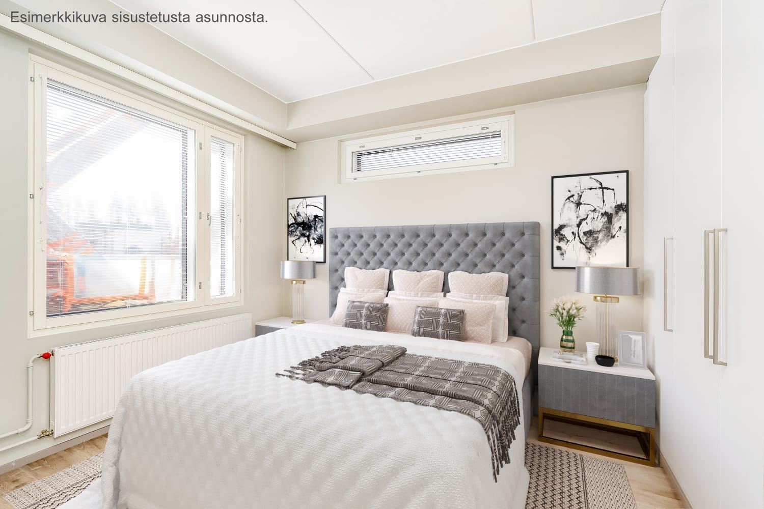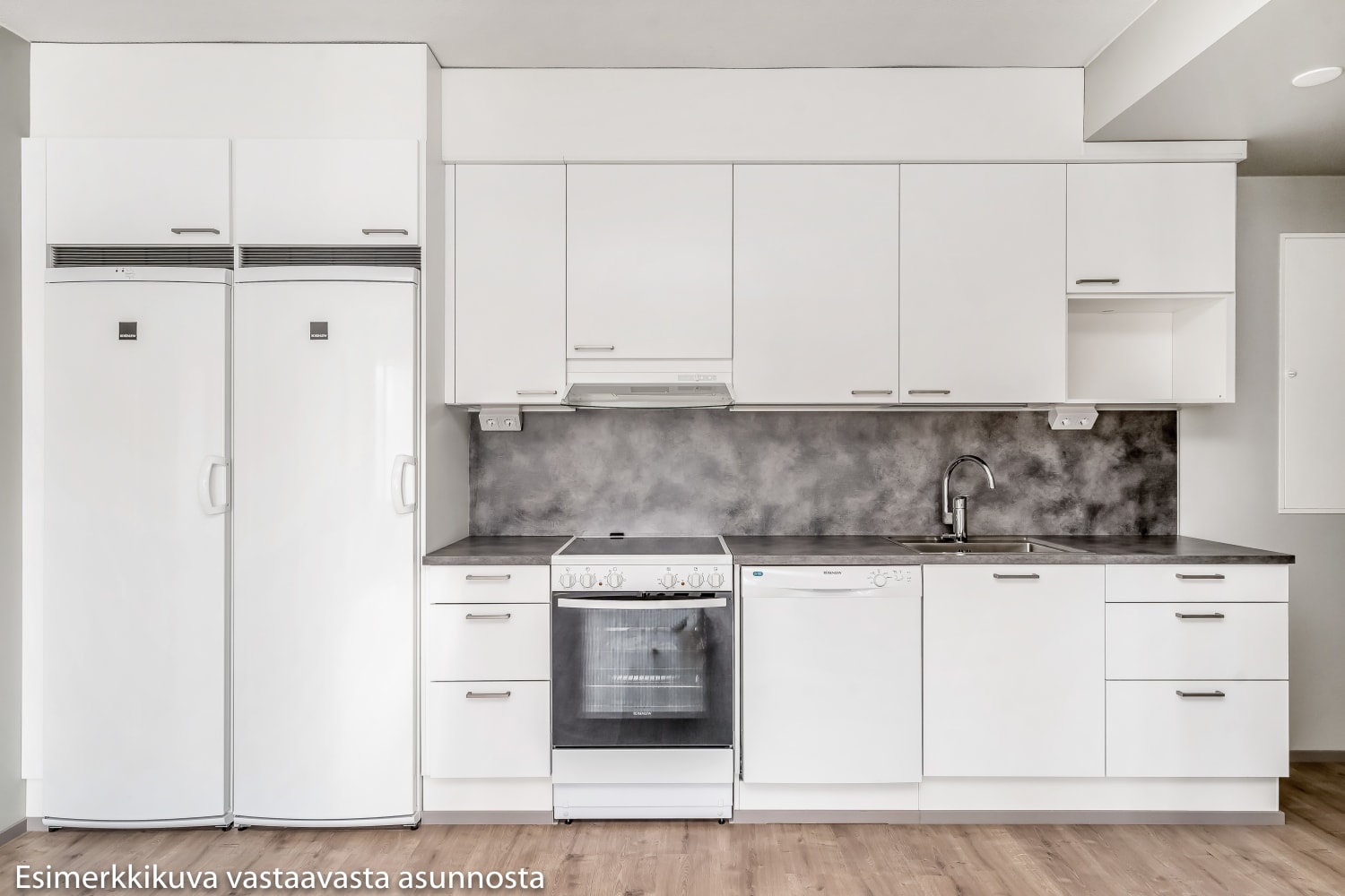 Lattiat ovat harmaaseen vivahtavaa tammilaminaattia ja seinät on maalattu siihen sointuvalla vaalealla harmaalla. Ikkunoissa on valkoiset sälekaihtimet. Keittiön kalusteet ovat valkoiset. Ylä- ja alakaappien välinen tila ja työtaso ovat harmaata laminaattia. Keittiön varustukseen kuuluu jääkaappipakastin, astianpesukone, keraaminen liesi ja liesikupu sekä varaus mikroaaltouunille. Kodinkoneet ovat valkoisia. Kylpyhuoneessa kalusteet ovat SATOn Kide-mallistoa ja kotimaista Kankarin kalusteen tuotantoa. Niiden materiaali on erittäin kestävää ja kaunista valkoista massiivilaminaattia. Seinät ovat valkoista laattaa ja lattian laatoituksen sävy on tumman harmaa. Pesukoneelle on oma paikkansa.