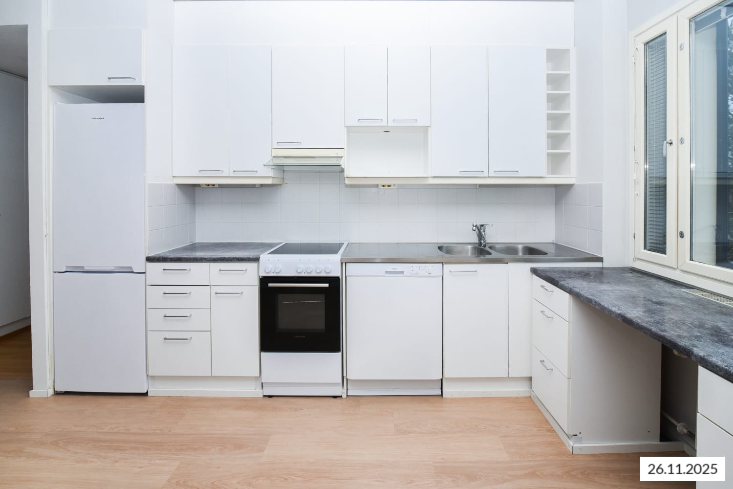 Keittiössä on jää-pakastinkaappi ja tilavaraus toiselle kylmälaitteelle, mikroaaltouunille sekä astianpesukoneellesi.