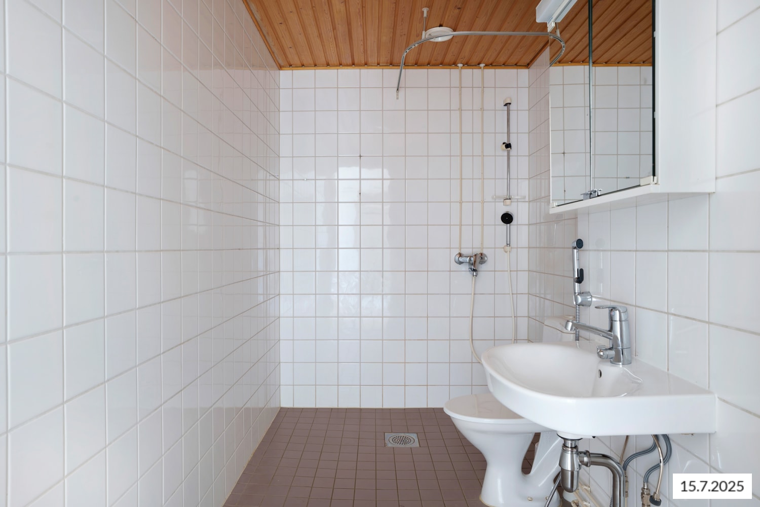 Keittiössä on astianpesukone arjen askareita helpottamaan. Laatoitetussa kylpyhuoneessa on pesukoneliitännät.