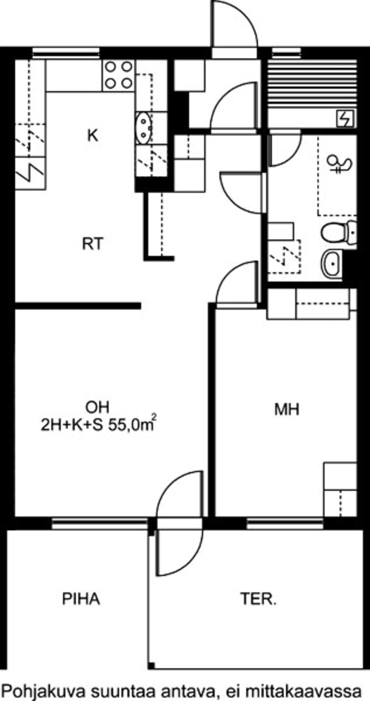 Keittiö tarjoaa hyvät puitteet kotikokille, ja sinne mahtuu mukavasti ruokapöytä yhteisiä ateriahetkiä varten. Kylpyhuoneessa on tilaa pyykkikoneelle.