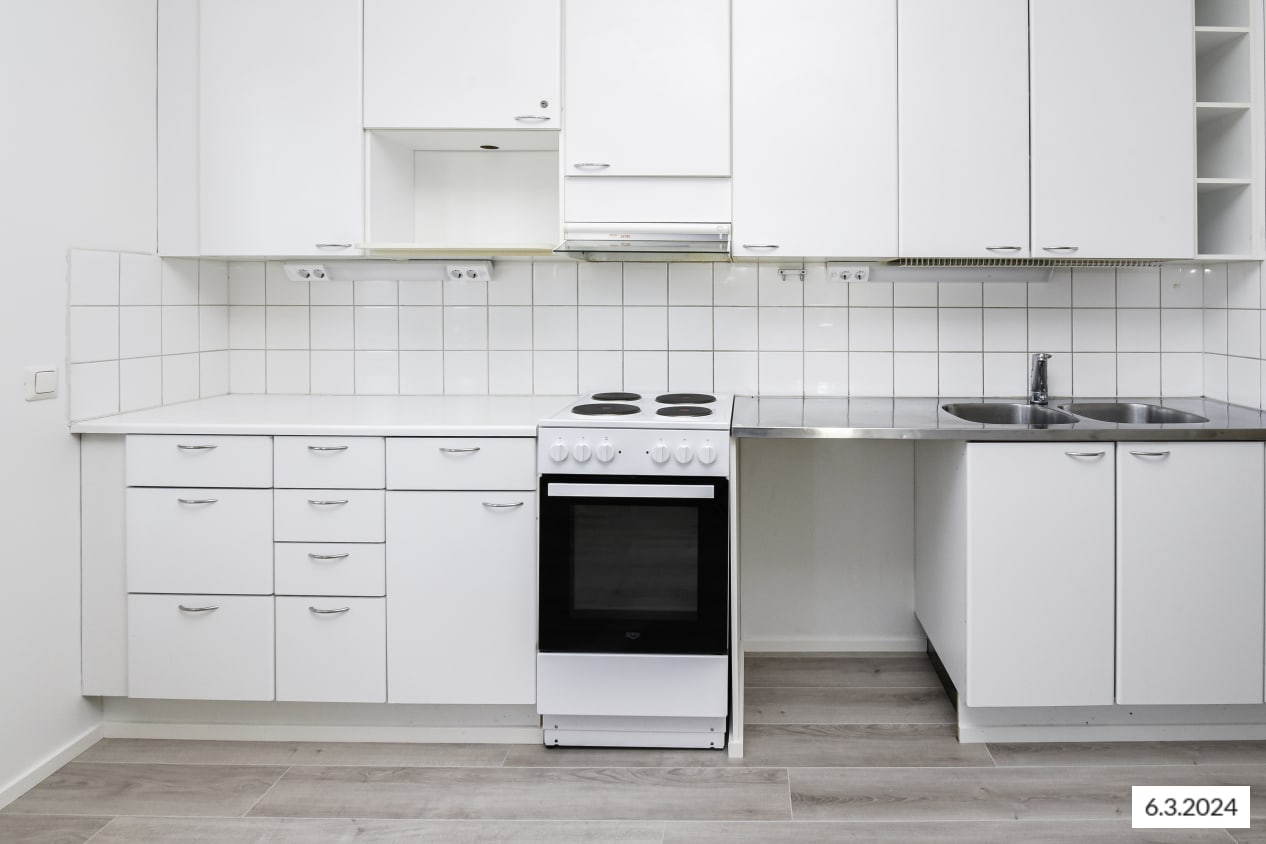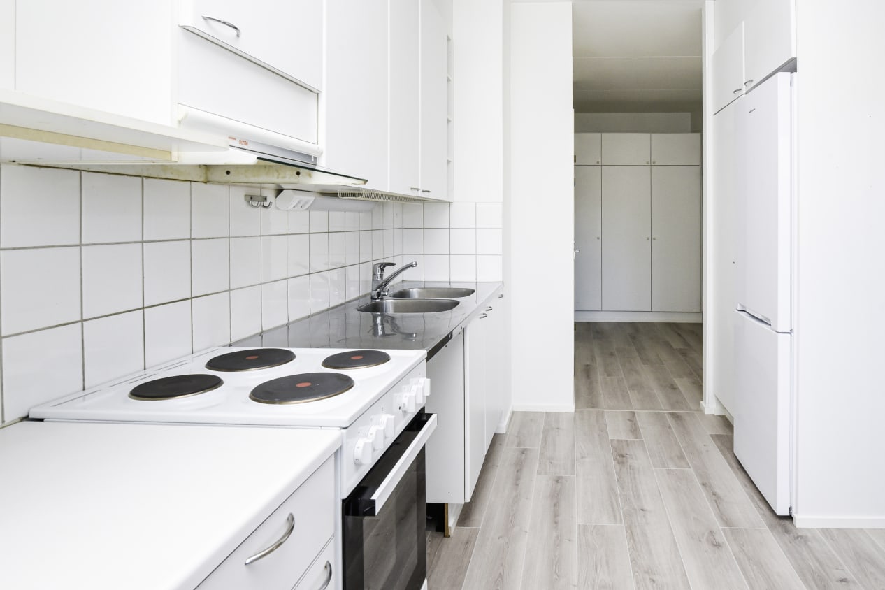 Osittain olohuoneeseen avautuvassa keittiössä on varaus astianpesukoneelle. Jää-pakastinkaappi löytyy, ja keittiöön on mahdollista sijoittaa lisäkylmäkaluste. Laatoitetussa kylpyhuoneessa on tilavaraus pyykinpesukoneelle.