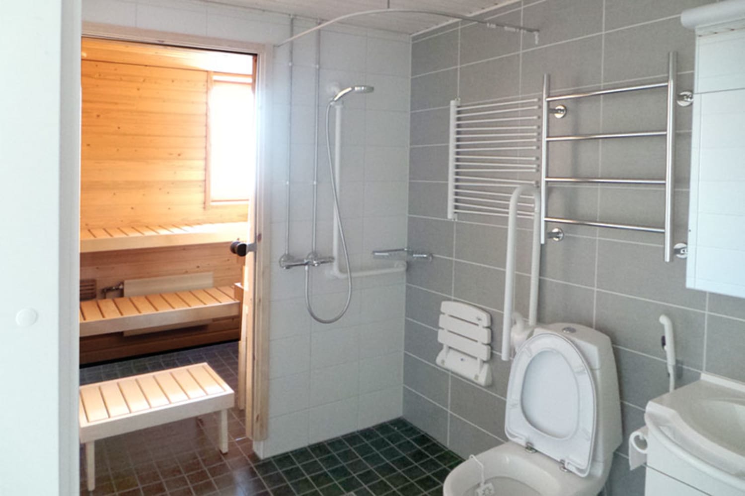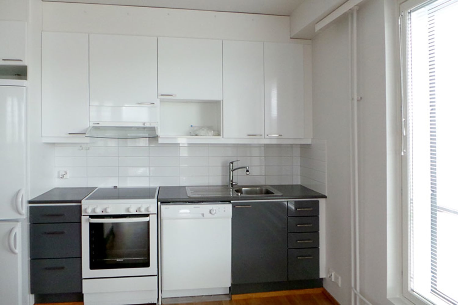 Asuinhuoneiden lattiat ovat tammiparkettia ja harmaavalkoiseksi kaakeloidussa kylpyhuoneessa on mukavuuslattialämmitys. Keittiössä on kiiltävät valkoiset yläkaapit, tyylikkään harmaat alakaapit ja tummanharmaa työtaso taivereunaista laminaattia. Vakiovarusteina ovat astianpesukone, jää-pakastinkaappi ja keraaminen liesi.