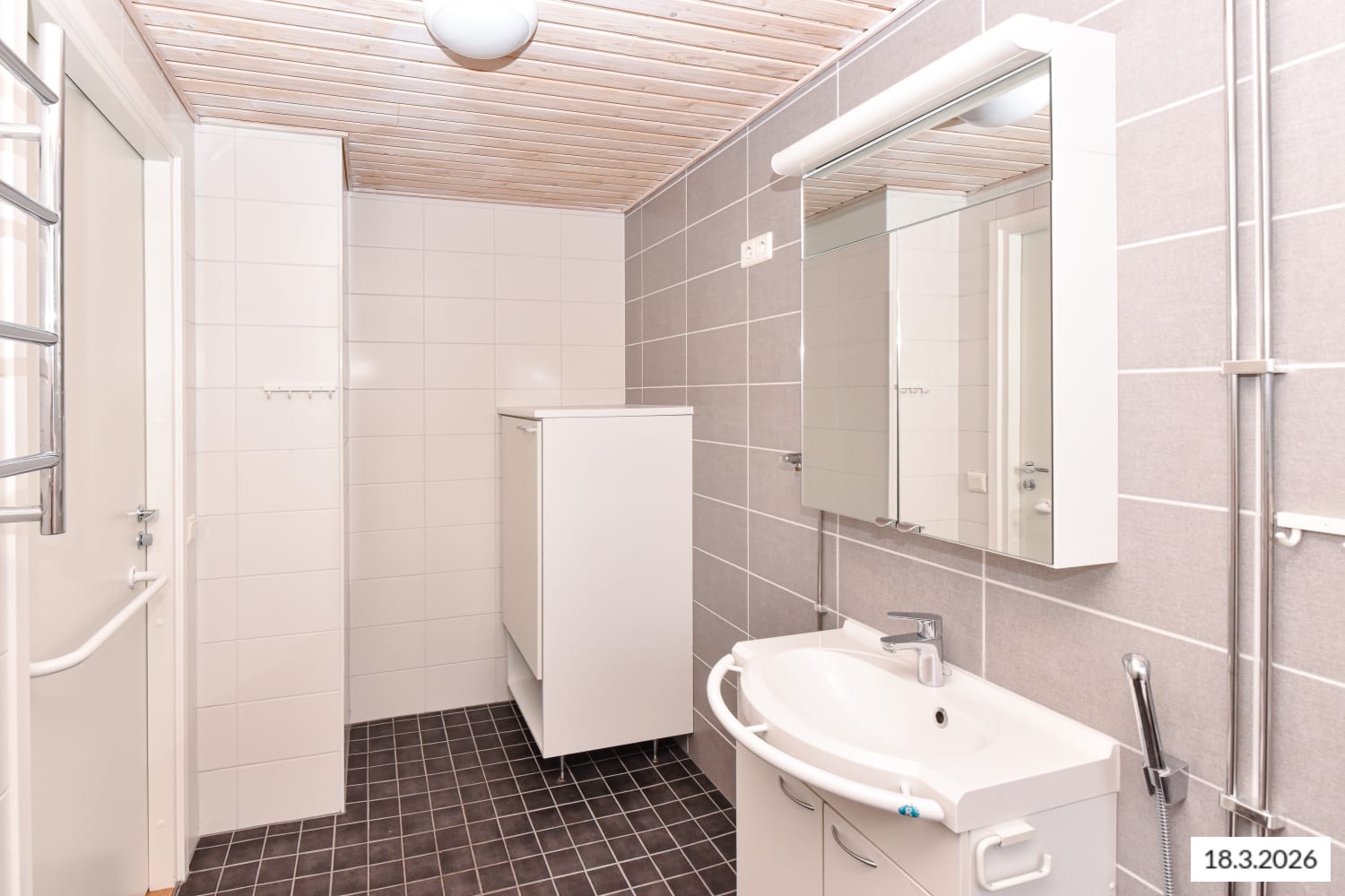 Asunnossa on tammiparkettilattiat ja harmaavalkoiseksi kaakeloidussa kylpyhuoneessa mukavuuslattialämmitys. Keittokomerossa on kiiltävät valkoiset yläkaapit, tyylikkään harmaat alakaapit ja antrasiitinharmaa työtaso taivereunaista laminaattia. Vakiovarusteina ovat astianpesukone, jää-pakastinkaappi ja keraaminen liesi.