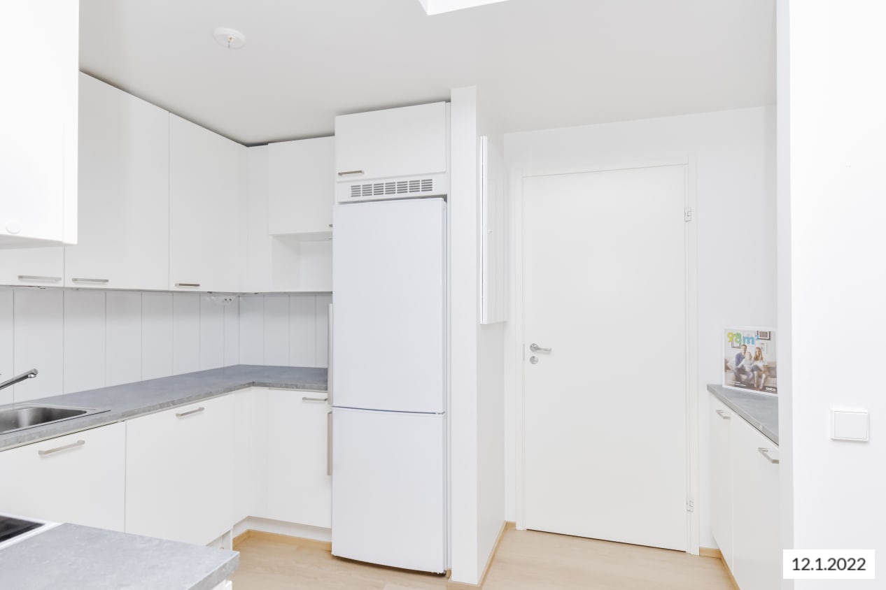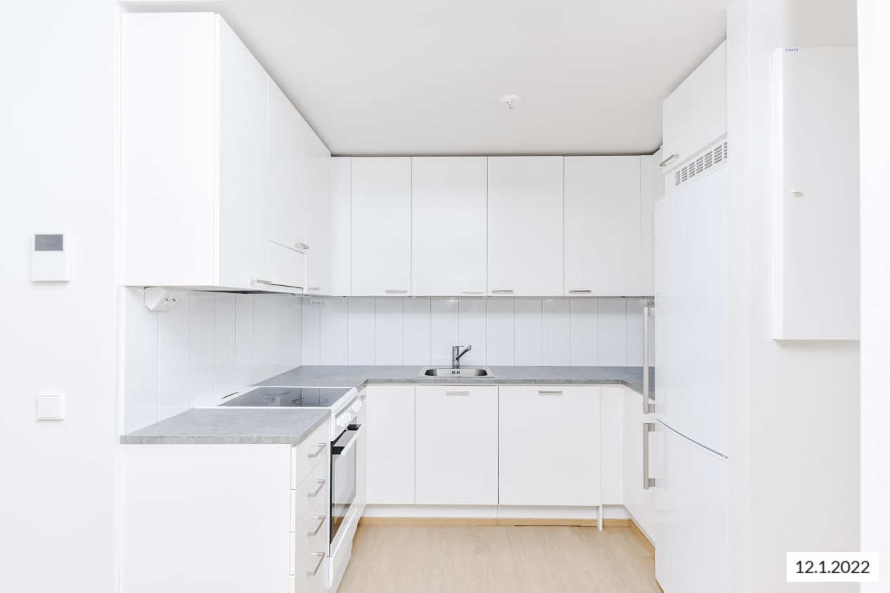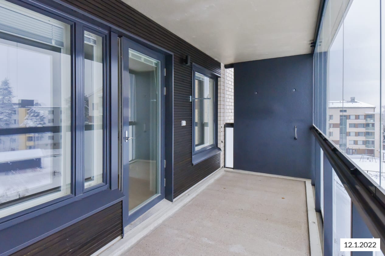 Kauniin kaksion hillityt materiaalit ja olohuoneeseen avautuva tyylikäs keittiö luovat puitteet monenlaiselle sisustamiselle. Tilavassa makuuhuoneessa on mukavasti kaappitilaa. Pihan puolelle aukeava lasitettu parveke on kuin lisähuone, jonka voi sisustaa viihtyisäksi kesäkeitaaksi. Asuintilojen lattiat ovat valkaistun tammen sävyistä laminaattia. Valkoiseksi maalattuja seinäpintoja elävöittää hillityn harmaa tehosteseinä. Keittiössä kaapistojen ovet ovat valkoiset ja vetimet ovat harjattua kromia. Ylä- ja alakaappien välinen tila on laatoitettu kiiltävän valkoisilla laatoilla. Työtaso on betonin harmaata laminaattia. Varustukseen kuuluu keraaminen liesi, astianpesukone ja jääkaappipakastin. Kylpyhuoneessa seinät ovat pääosin valkoista laattaa. Tehosteseinän ja lattian sävy on harmaa. Laattojen alla jalkoja hellii lattialämmitys. Pesukoneelle ja kuivausrummulle on varaus.