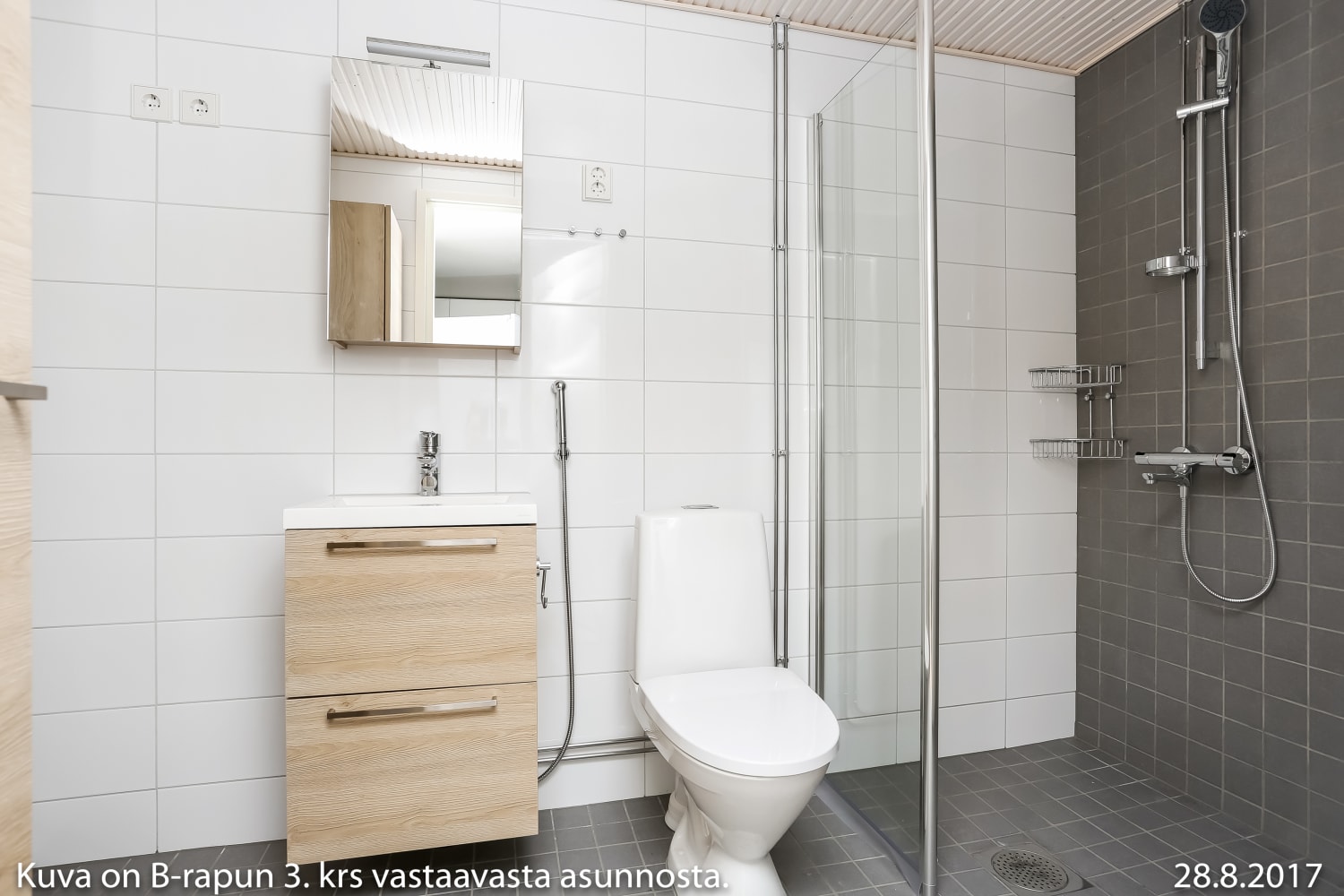 Kylpyhuoneessa seinät ovat pääosin valkoista laattaa. Tehosteseinän ja lattian sävy on harmaa. Laattojen alla jalkoja hellii lattialämmitys. Pesukoneelle ja kuivausrummulle on varaus.