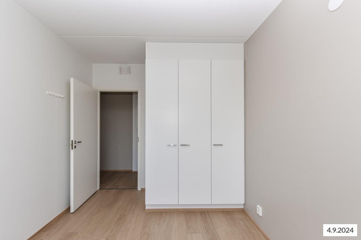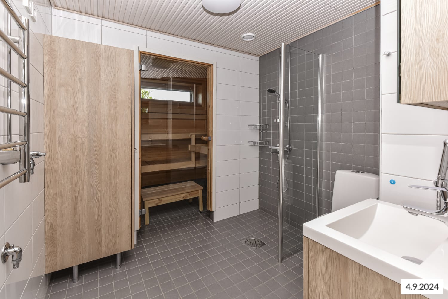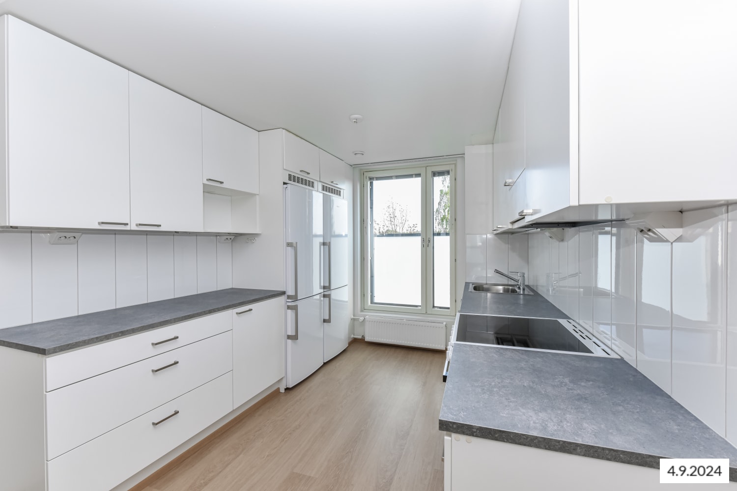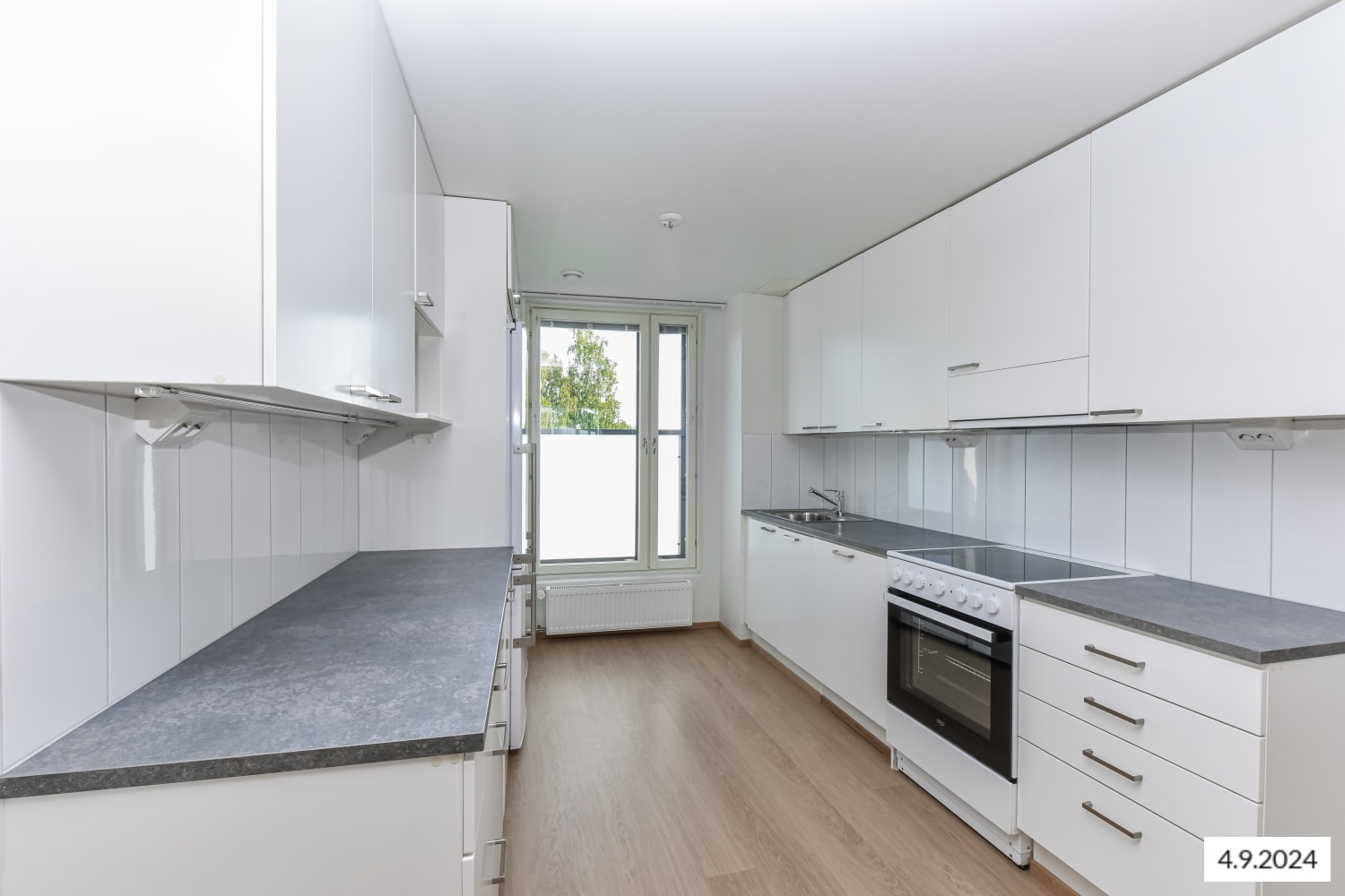 Asuintilojen lattiat ovat valkaistun tammen sävyistä laminaattia. Valkoiseksi maalattuja seinäpintoja elävöittää hillityn harmaa tehosteseinä. Keittiössä kaapistojen ovet ovat valkoiset ja vetimet ovat harjattua kromia. Ylä- ja alakaappien välinen tila on laatoitettu kiiltävän valkoisilla laatoilla. Työtaso on betonin harmaata laminaattia. Varustukseen kuuluu keraaminen liesi, astianpesukone ja jääkaappipakastin. Kylpyhuoneessa seinät ovat pääosin valkoista laattaa. Tehosteseinän ja lattian sävy on harmaa. Laattojen alla jalkoja hellii lattialämmitys. Pesukoneelle ja kuivausrummulle on varaus.