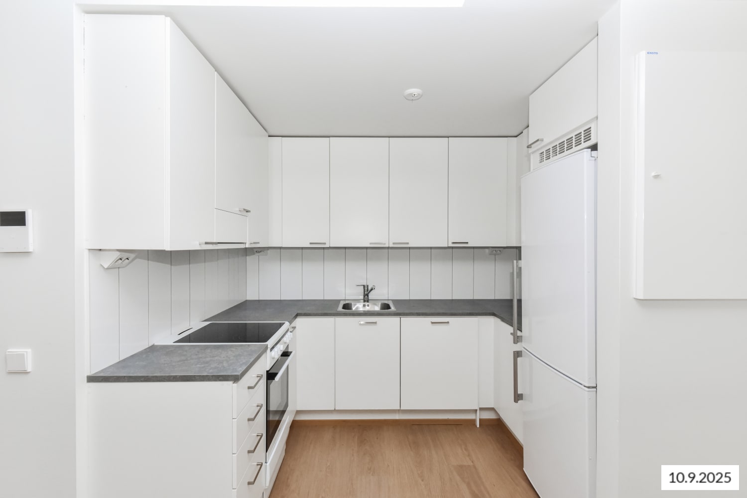 Asuintilojen lattiat ovat valkaistun tammen sävyistä laminaattia. Valkoiseksi maalattuja seinäpintoja elävöittää hillityn harmaa tehosteseinä. Keittiössä kaapistojen ovet ovat valkoiset ja vetimet ovat harjattua kromia. Ylä- ja alakaappien välinen tila on laatoitettu kiiltävän valkoisilla laatoilla. Työtaso on betonin harmaata laminaattia. Varustukseen kuuluu keraaminen liesi, astianpesukone ja jääkaappipakastin.